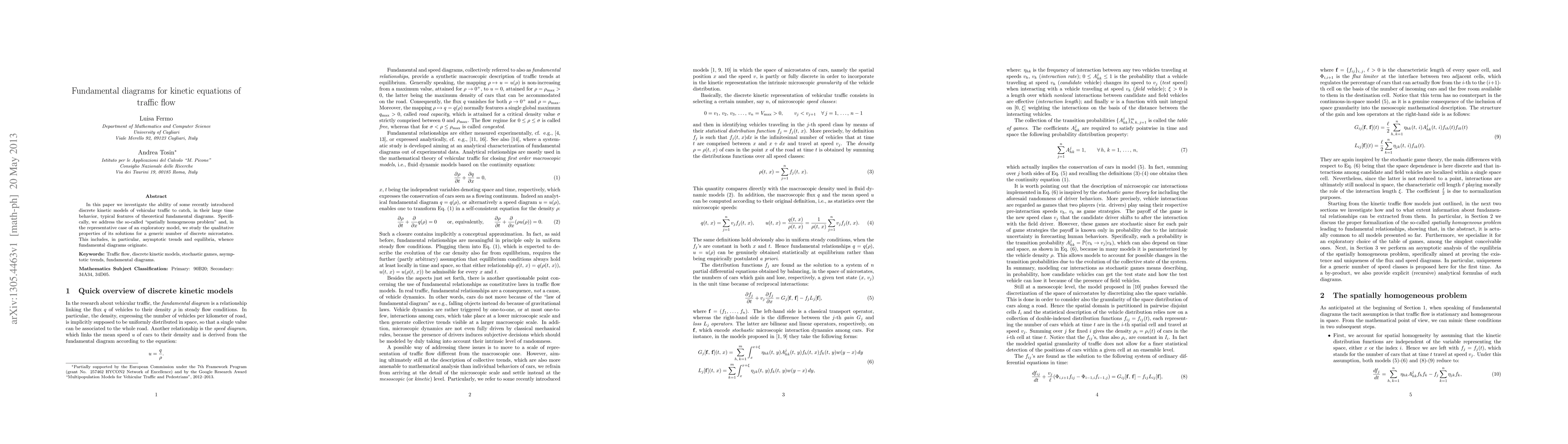 In this paper we investigate the ability of some recently introduced discrete kinetic models of vehicular traffic to catch, in their large time behavior, typical features of theoretical fundamental diagrams. Specifically, we address the so-called "spatially homogeneous problem" and, in the representative case of an exploratory model, we study the qualitative properties of its solutions for a generic number of discrete microstates. This includes, in particular, asymptotic trends and equilibria, whence fundamental diagrams originate.