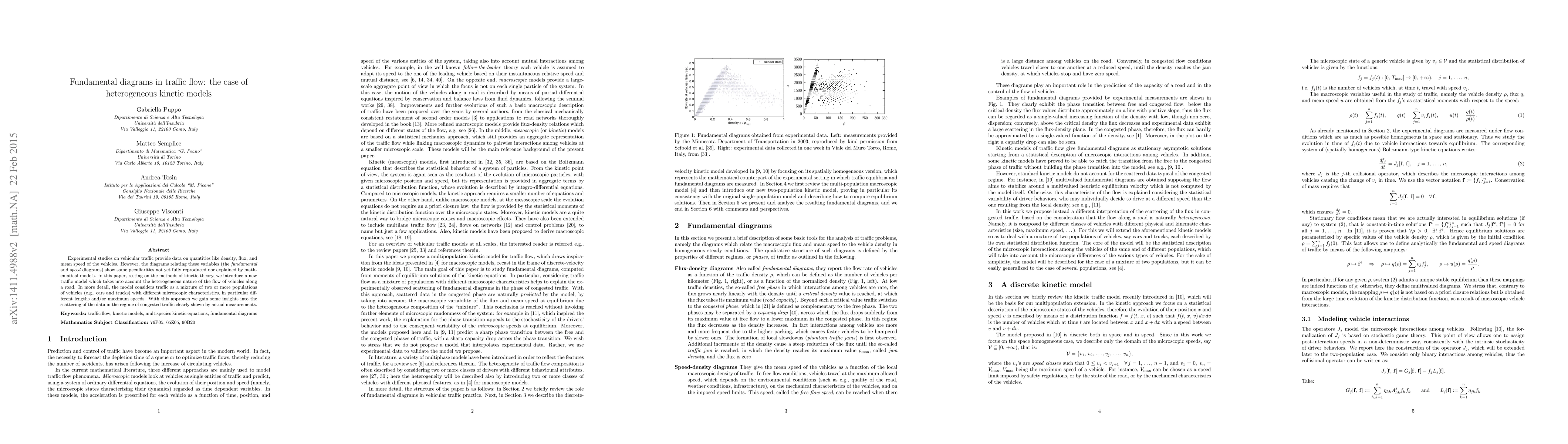 Experimental studies on vehicular traffic provide data on quantities like density, flux, and mean speed of the vehicles. However, the diagrams relating these variables (the fundamental and speed diagrams) show some peculiarities not yet fully reproduced nor explained by mathematical models. In this paper, resting on the methods of kinetic theory, we introduce a new traffic model which takes into account the heterogeneous nature of the flow of vehicles along a road. In more detail, the model considers traffic as a mixture of two or more populations of vehicles (e.g., cars and trucks) with different microscopic characteristics, in particular different lengths and/or maximum speeds. With this approach we gain some insights into the scattering of the data in the regime of congested traffic clearly shown by actual measurements.