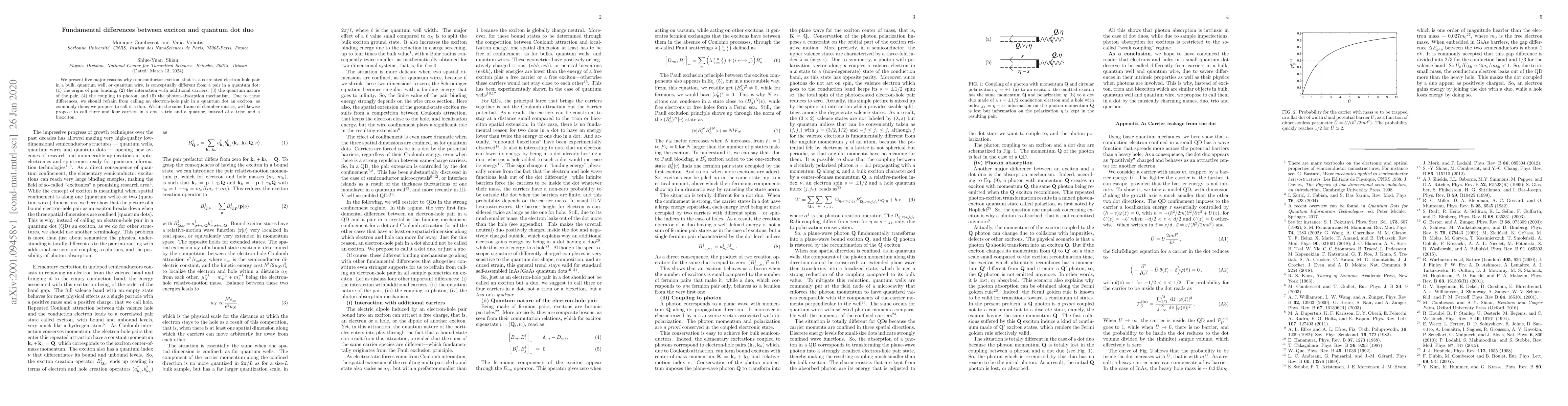 The paper highlights five fundamental differences between excitons in bulk or confined semiconductor structures and 'duos' (electron-hole pairs) in quantum dots. It proposes to rename duos, trios, and quatuors in quantum dots to avoid calling them excitons, trions, or biexcitons, respectively, due to conceptual distinctions in pair binding, carrier interactions, quantum nature, photon coupling, and absorption mechanisms.