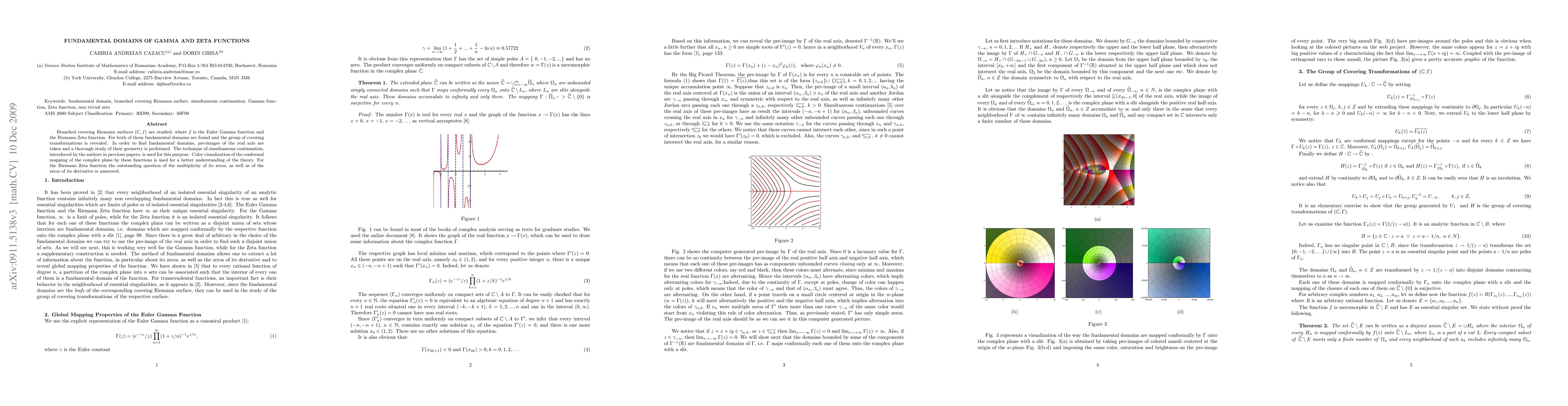 Branched covering Riemann surfaces $(\mathbb{C},f)$ are studied, where $f$ is the Euler Gamma function and the Riemann Zeta function. For both of them fundamental domains are found and the group of covering transformations is revealed. In order to find fundamental domains, pre-images of the real axis are taken and a thorough study of their geometry is performed. The technique of simultaneous continuation, introduced by the authors in previous papers, is used for this purpose. Color visualization of the conformal mapping of the complex plane by these functions is used for a better understanding of the theory. For the Riemann Zeta function the outstanding question of the multiplicity of its zeros, as well as of the zeros of its derivative is answered.