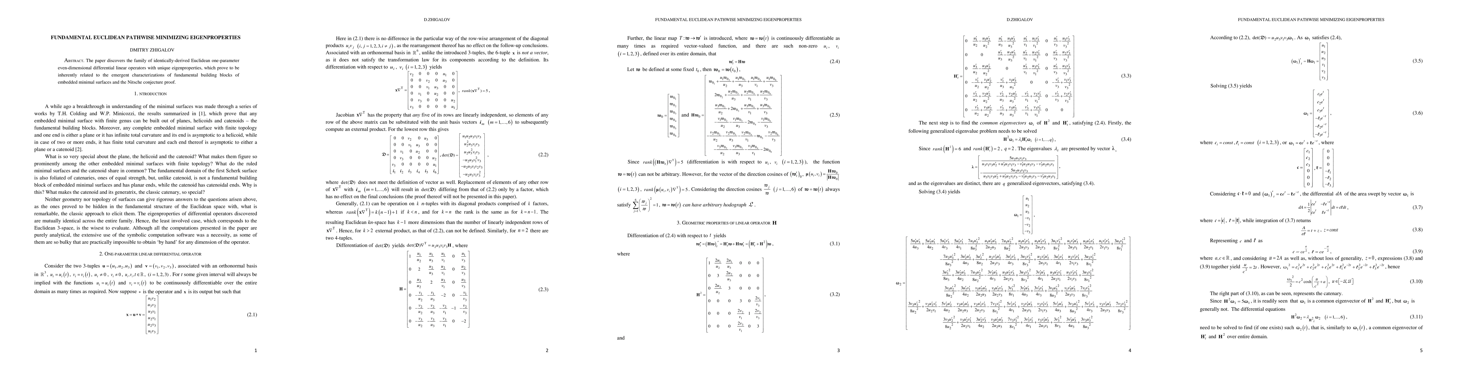 The paper discovers the family of identically-derived Euclidean one-parameter even-dimensional differential linear operators with unique eigenproperties, which prove to be inherently related to the emergent characterizations of fundamental building blocks of embedded minimal surfaces and the Nitsche conjecture proof.