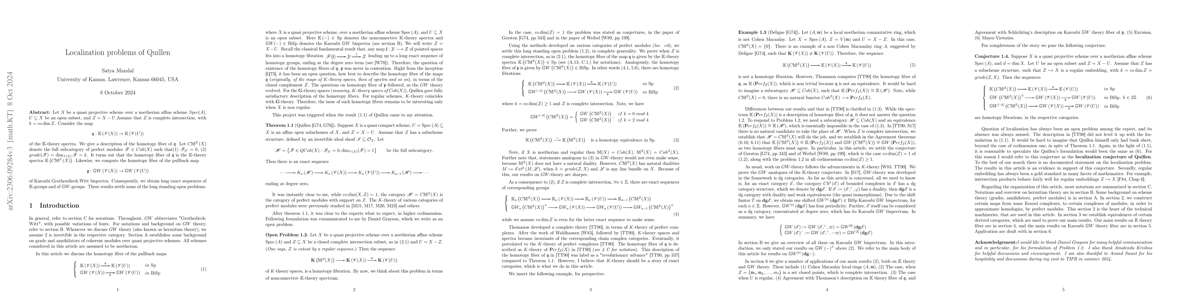 Let $X$ be a quasi projective scheme over a noetherian affine scheme $Spec(A)$, $U\subseteq X$ be an open subset, and $Z=X-U$. Consider the map $q:{\mathbb K}\left({\mathscr V}(X)\right) \rightarrow {\mathbb K}\left({\mathscr V} U)\right)$ of the ${\mathbb K}$-theory spectra. We give a description of the homotopy fiber of $q$. Let $C{\mathbb M}^Z\left({\mathscr V}(X) \right)$ denote the full subcategory of ${\mathscr F} \in Coh(X)$ such that (1) ${\mathscr F}_{|U}=0$, (2) $grade(Z, X)=grade({\mathscr F} )=\dim_{{\mathscr V}(X)}{\mathscr F} $. It turns out that the homotopy fiber of $q$ is the ${\mathbb K}$-theory spectra ${\mathbb K}\left(C{\mathbb M}^Z\left({\mathscr V}(X) \right)\right)$. Likewise, we compute the homotopy fiber of the the pullback map $$g: {\mathbb G}W\left({\mathscr V}(X)\right) \rightarrow {\mathbb G}W\left({\mathscr V}(U)\right)$$ of Grothendieck-Witt bispectra. Consequently, we obtain long exact sequences of ${\mathbb K}$-groups and of ${\mathbb G}W$-groups.