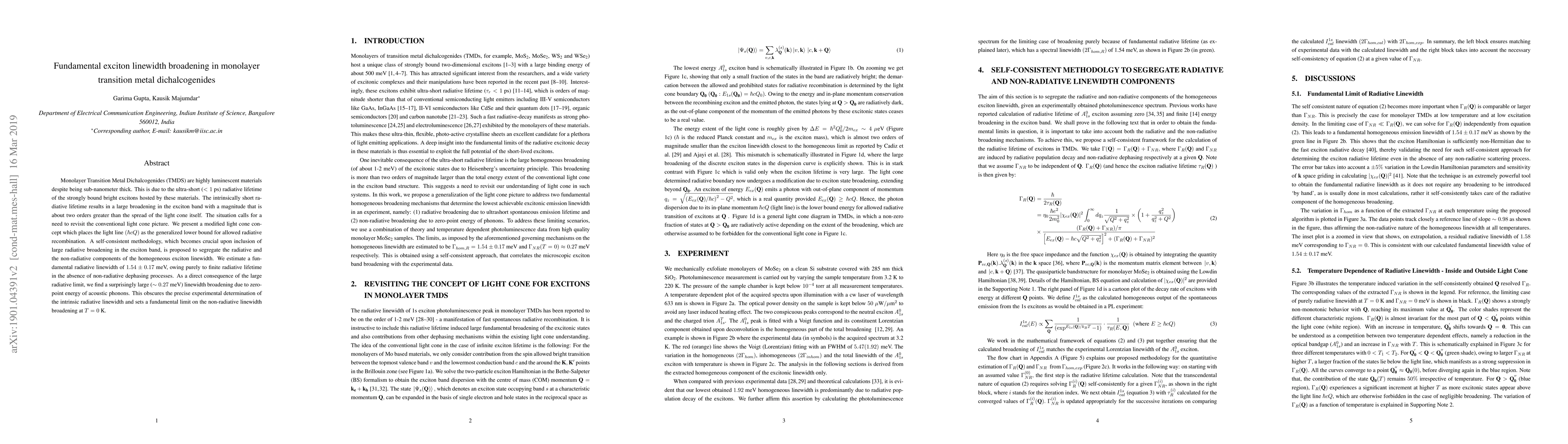 This paper investigates the fundamental linewidth broadening in monolayer TMDS, revealing a large radiative broadening due to ultra-short exciton lifetimes. It proposes a modified light cone concept and estimates a fundamental radiative linewidth, highlighting the significant impact of acoustic phonon zero-point energy on the linewidth broadening.