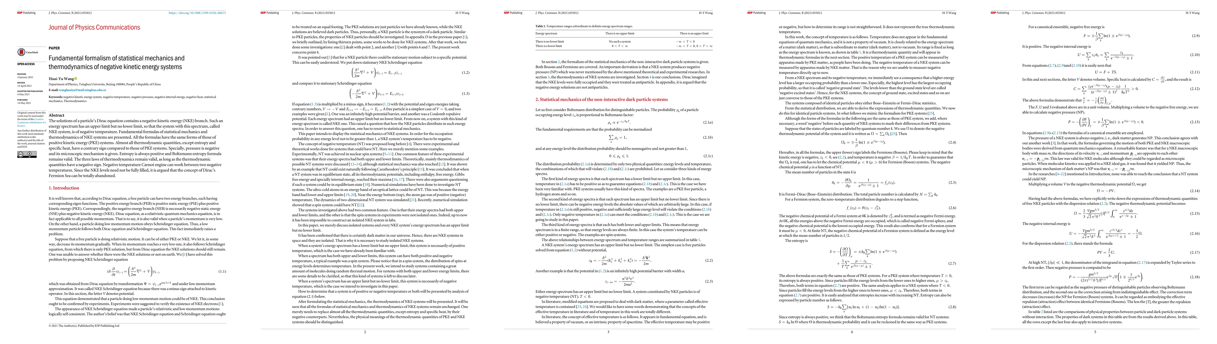 This paper explores the statistical mechanics and thermodynamics of negative kinetic energy (NKE) systems, revealing that NKE systems exhibit thermodynamic properties opposite to those of positive kinetic energy systems, including negative pressure and temperature. The fundamental formulas remain similar, but entropy and specific heat differ in sign, and a negative temperature Carnot engine is feasible.