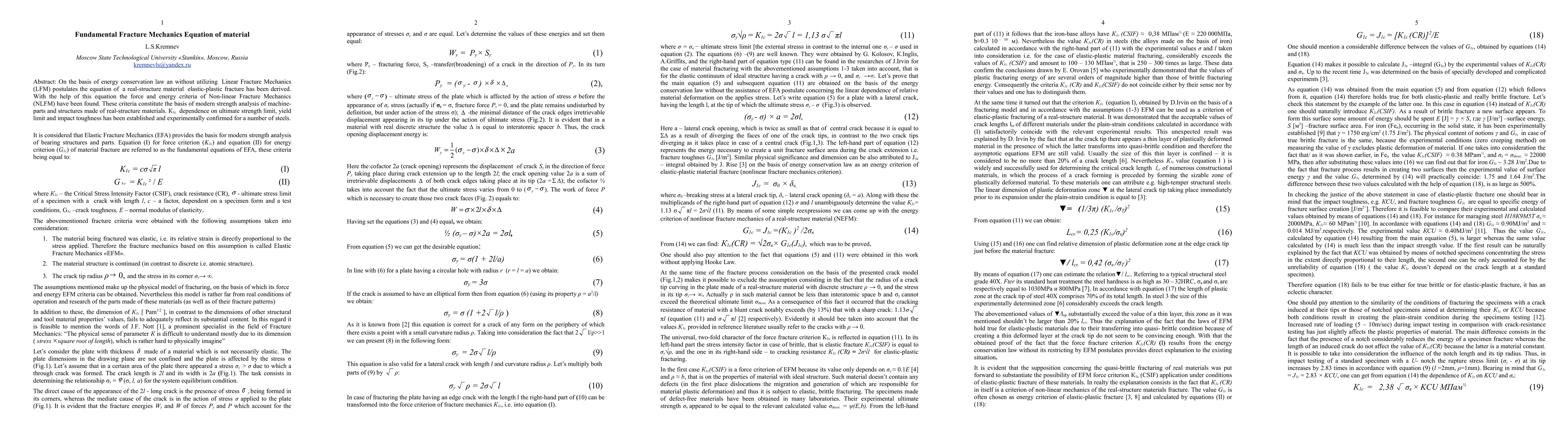 On the basis of energy conservation law an without utilizing Linear Fracture Mechanics (LFM) postulates the equation of a real-structure material elastic-plastic fracture has been derived. With the help of this equation the force and energy criteria of Non-linear Fracture Mechanics (NLFM) have been found. These criteria constitute the basis of modern strength analysis of machineparts and structures made of real-structure materials. $K_{lc}$ dependence on ultimate strength limit, yield limit and impact toughness has been established and experimentally confirmed for a number of steels