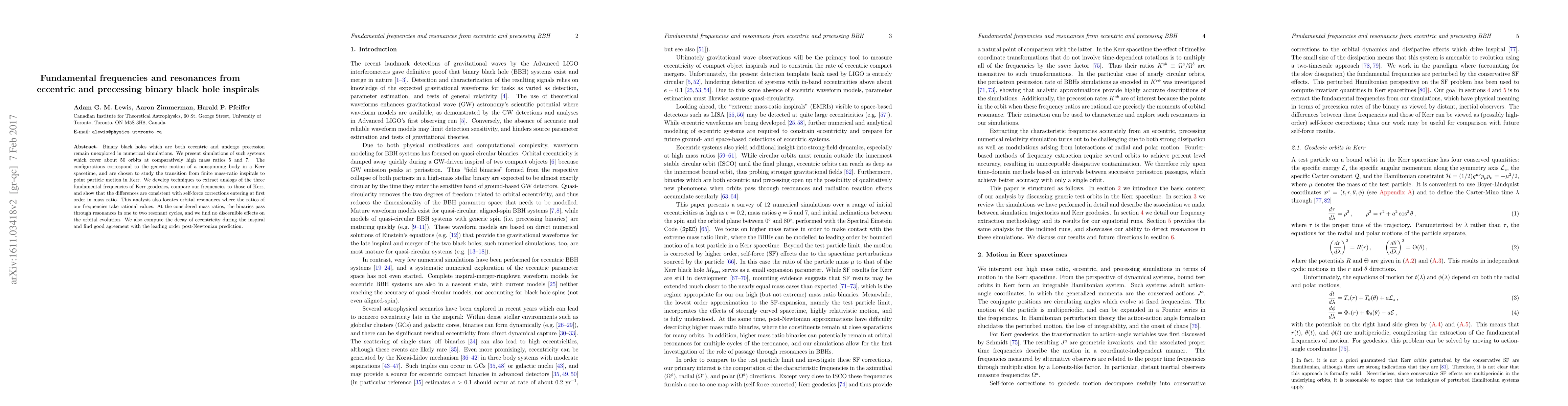 This paper presents numerical simulations of eccentric and precessing binary black hole inspirals, focusing on high mass ratios and the transition from finite mass-ratio to point particle motion. The study identifies fundamental frequencies and resonances, comparing them to Kerr geodesics and finding self-force corrections.