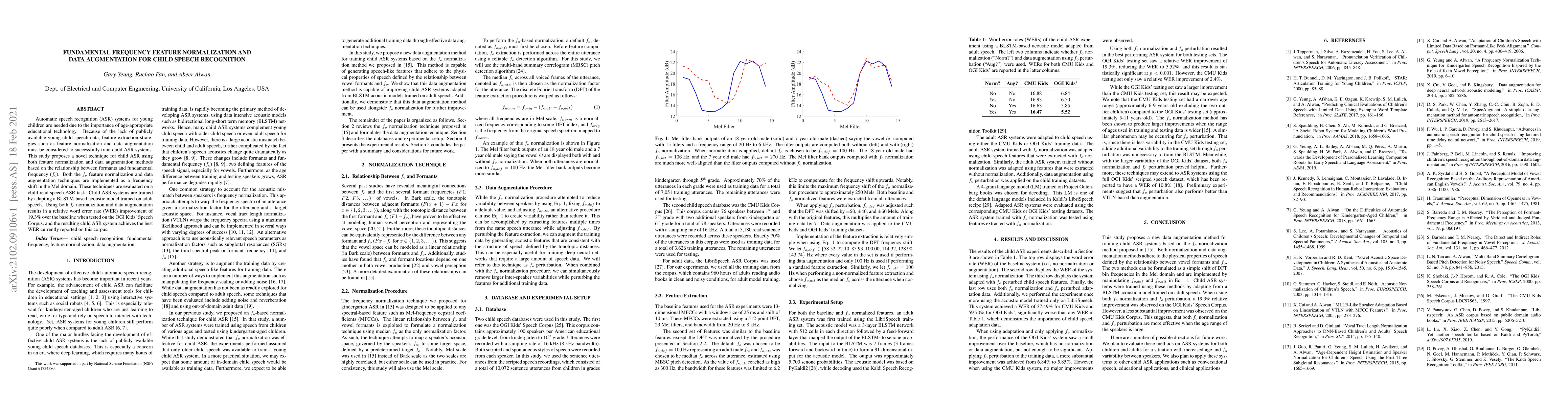 This study proposes a novel technique for child automatic speech recognition (ASR) that employs feature normalization and data augmentation based on fundamental frequency ($f_o$) to address the lack of child speech data. The techniques yield a 19.3% relative improvement in word error rate (WER) over the baseline, achieving the best WER reported on the OGI Kids' Speech Corpus.