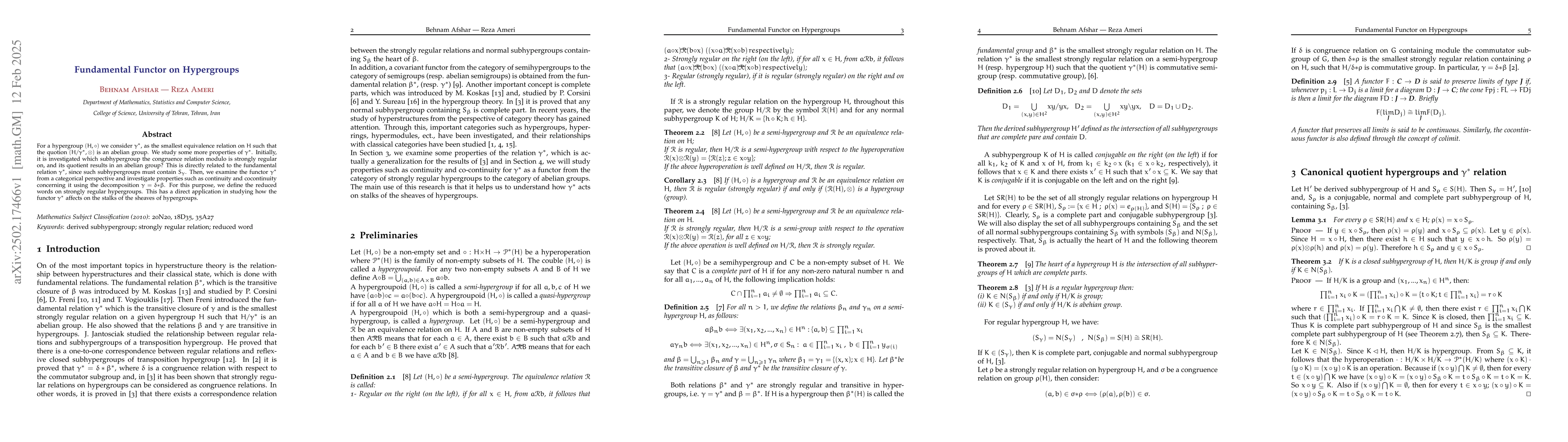 For a hypergroup $(H,\circ)$ we consider $\gamma^{\ast}$, as the smallest equivalence relation on $H$ such that the quotion $(H/\gamma^{\ast},\tiny{\otimes})$ is an abelian group. We study some more properties of $\gamma^{\ast}$. Initially, it is investigated which subhypergroup the congruence relation modulo is strongly regular on, and its quotient results in an abelian group? This is directly related to the fundamental relation $\gamma^{\ast}$, since such subhypergroups must contain $S_{\gamma}$. Then, we examine the functor $\gamma^{\ast}$ from a categorical perspective and investigate properties such as continuity and cocontinuity concerning it using the decomposition $\gamma=\delta\tiny{\ast}\beta$. For this purpose, we define the reduced words on strongly regular hypergroups. This has a direct application in studying how the functor $\gamma^{\ast}$ affects on the stalks of the sheaves of hypergroups.