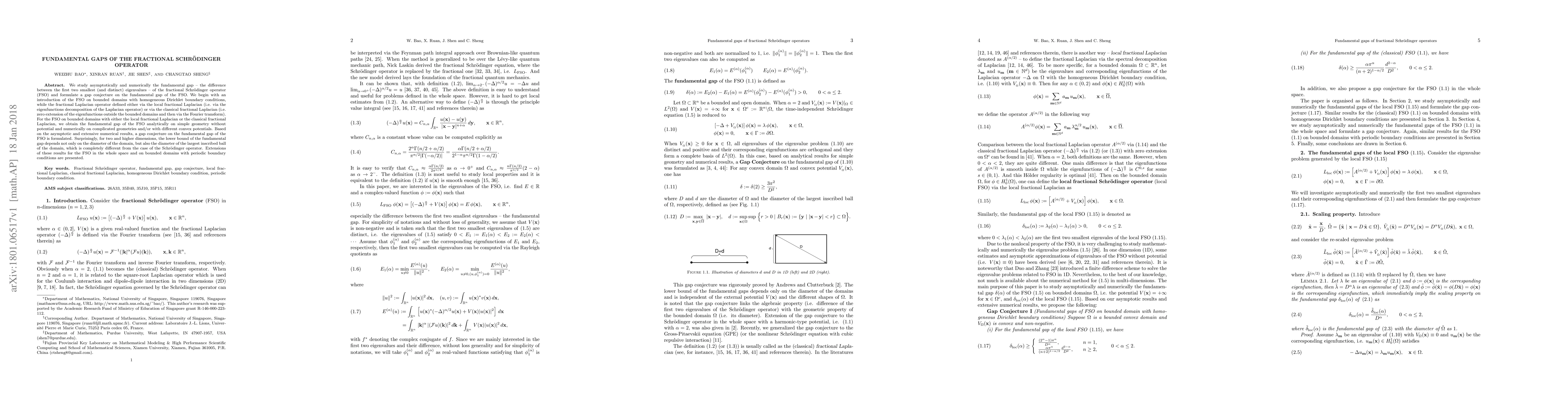 We study asymptotically and numerically the fundamental gap -- the difference between the first two smallest (and distinct) eigenvalues -- of the fractional Schr\"{o}dinger operator (FSO) and formulate a gap conjecture on the fundamental gap of the FSO. We begin with an introduction of the FSO on bounded domains with homogeneous Dirichlet boundary conditions, while the fractional Laplacian operator defined either via the local fractional Laplacian (i.e. via the eigenfunctions decomposition of the Laplacian operator) or via the classical fractional Laplacian (i.e. zero extension of the eigenfunctions outside the bounded domains and then via the Fourier transform). For the FSO on bounded domains with either the local fractional Laplacian or the classical fractional Laplacian, we obtain the fundamental gap of the FSO analytically on simple geometry without potential and numerically on complicated geometries and/or with different convex potentials. Based on the asymptotic and extensive numerical results, a gap conjecture on the fundamental gap of the FSO is formulated. Surprisingly, for two and higher dimensions, the lower bound of the fundamental gap depends not only on the diameter of the domain, but also the diameter of the largest inscribed ball of the domain, which is completely different from the case of the Schr\"{o}dinger operator. Extensions of these results for the FSO in the whole space and on bounded domains with periodic boundary conditions are presented.
