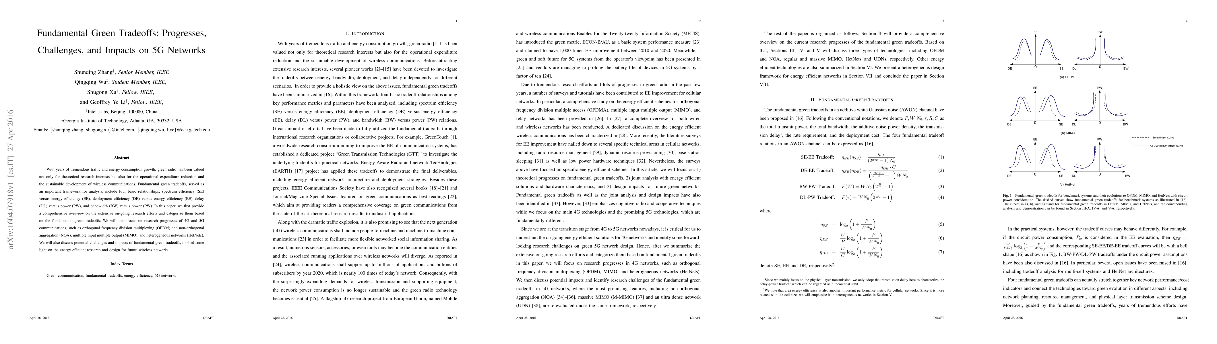 This paper provides a comprehensive overview of fundamental green tradeoffs in wireless communications, focusing on spectrum efficiency vs. energy efficiency, deployment efficiency vs. energy efficiency, delay vs. power, and bandwidth vs. power. It discusses research progresses in 4G and 5G technologies, highlighting challenges and impacts on future energy-efficient network designs.