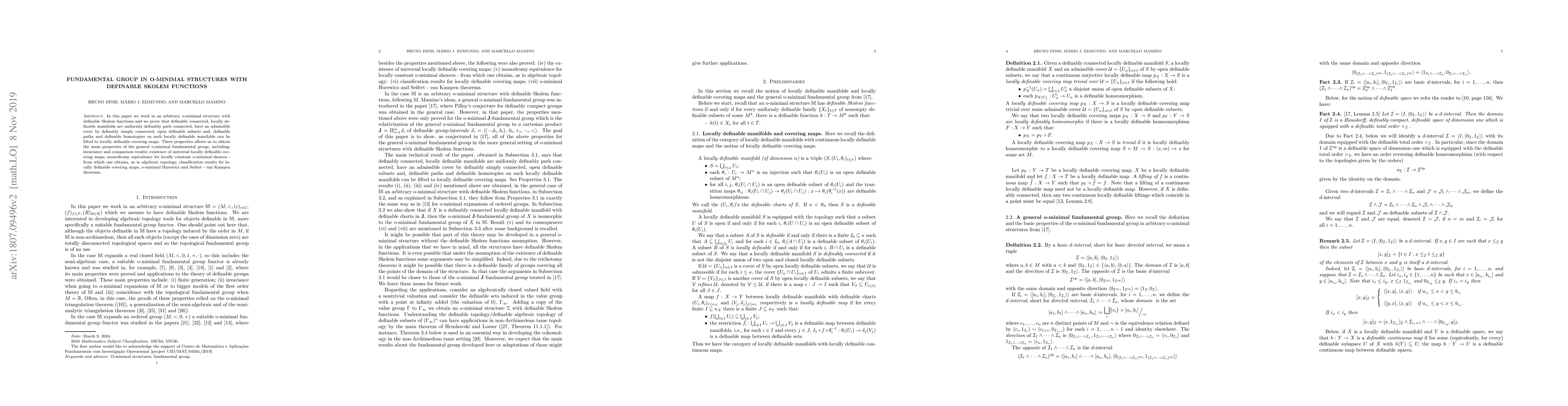 This paper demonstrates that in o-minimal structures with definable Skolem functions, definably connected, locally definable manifolds exhibit uniform definably path connectivity and admit covers by definably simply connected subsets. These properties enable the derivation of fundamental group properties, including invariance, comparison results, and classification theorems akin to those in algebraic topology.