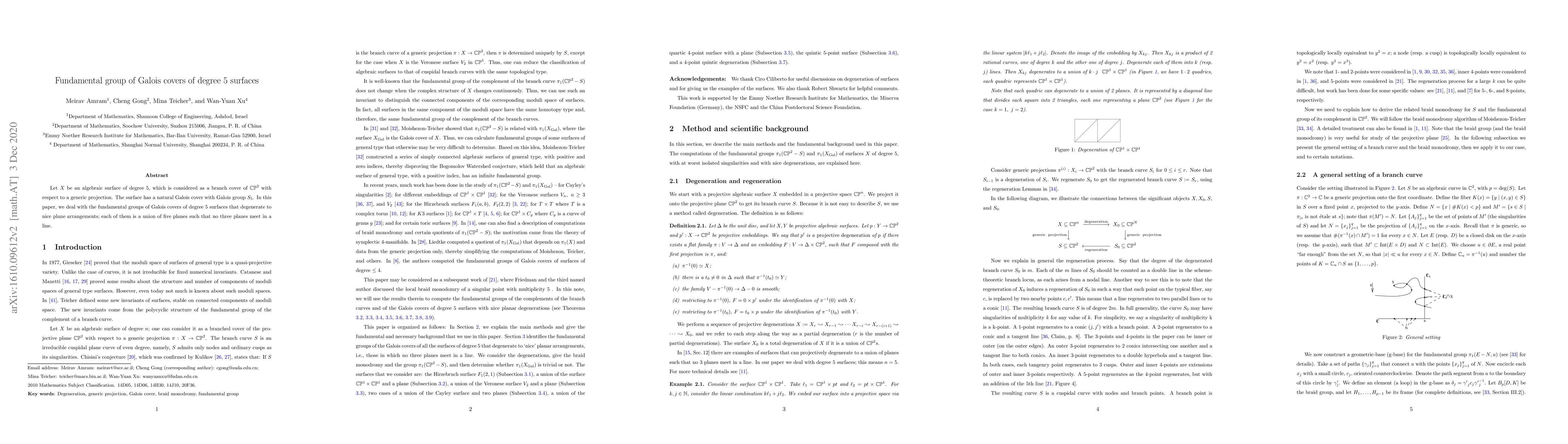 This paper investigates the fundamental groups of Galois covers of degree 5 algebraic surfaces, which are branch covers of $\mathbb{CP}^2$ with a Galois group $S_5$, focusing on degenerations to plane arrangements of five planes with no three meeting in a line.