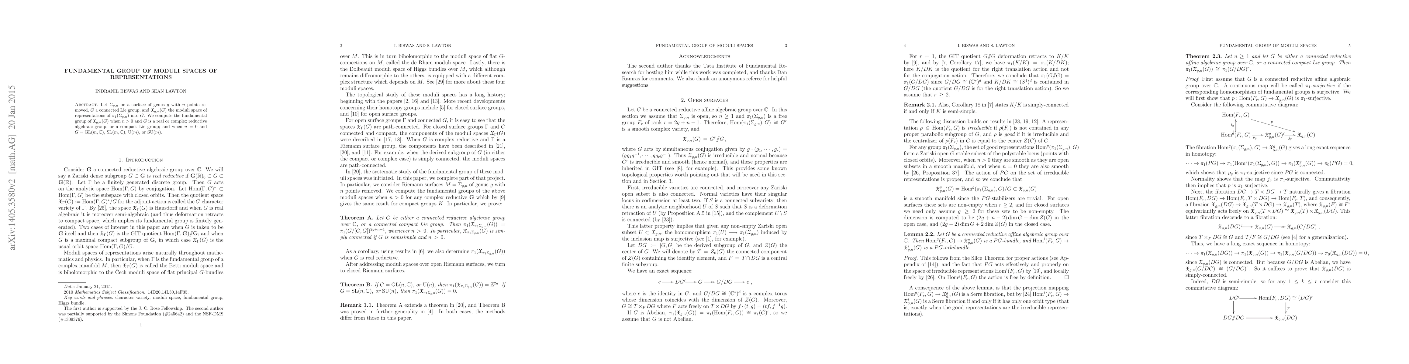 Let S be a surface of genus g with n points removed, G a connected Lie group, and X(G) the moduli space of representations of the fundamental group of S into G. We compute the fundamental group of X(G) when n>0 and G is a real or complex reductive algebraic group, or a compact Lie group; and when n=0 and G=GL(m,C), SL(m,C), U(m), or SU(m).