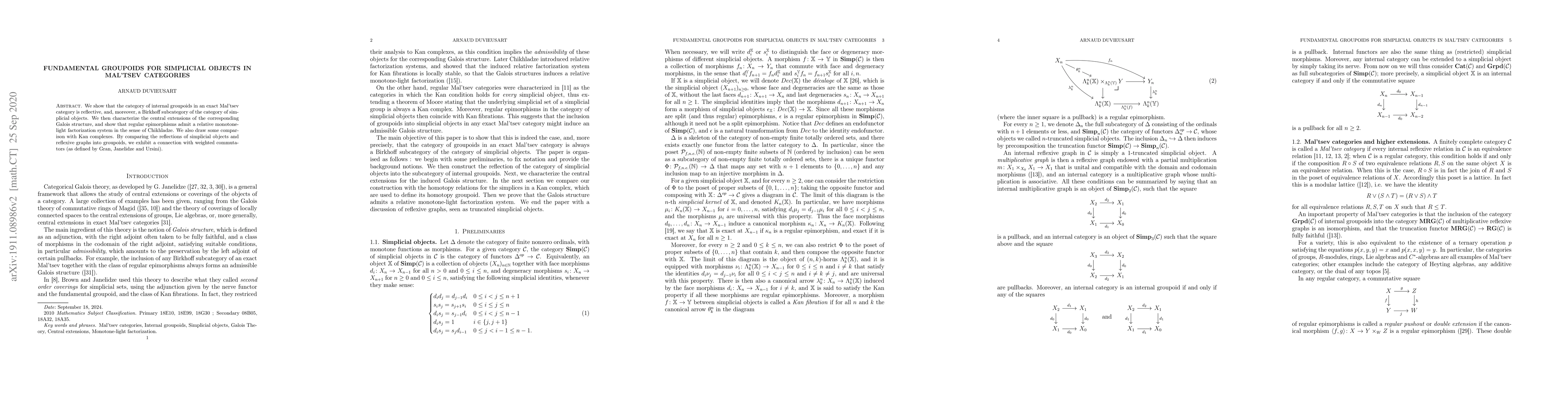 This paper demonstrates that internal groupoids in exact Mal'tsev categories form a reflective and Birkhoff subcategory of simplicial objects, characterizing their Galois structure's central extensions and establishing a factorization system for regular epimorphisms. It also links these findings to weighted commutators via reflections of simplicial objects and reflexive graphs.