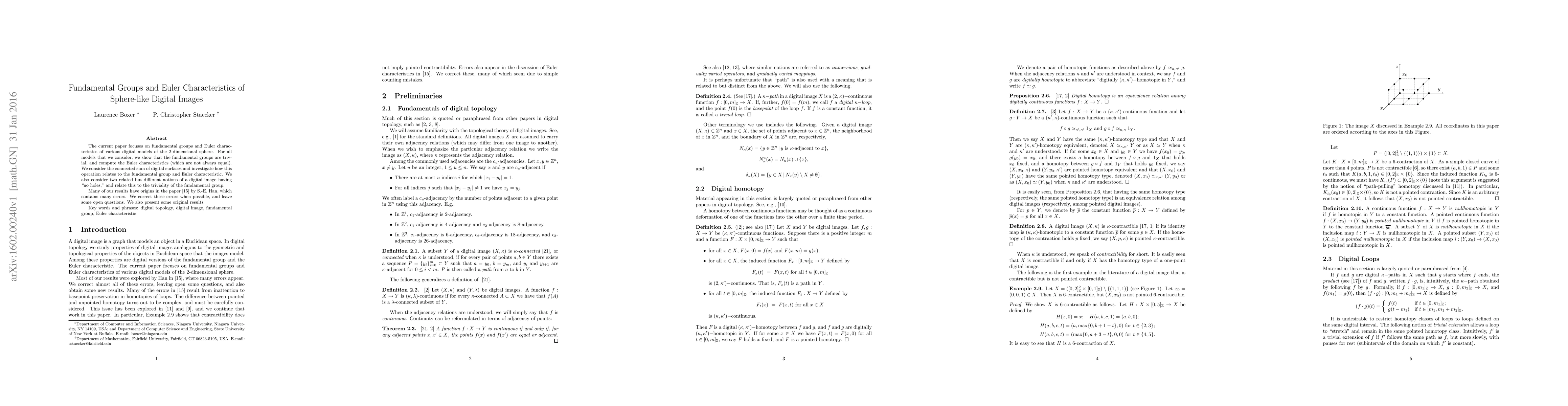 This paper investigates the fundamental groups and Euler characteristics of digital models of the 2-dimensional sphere, demonstrating that their fundamental groups are trivial and computing varying Euler characteristics. It also examines the connected sum of digital surfaces and the implications for these topological properties, correcting errors from a prior study and presenting new findings.