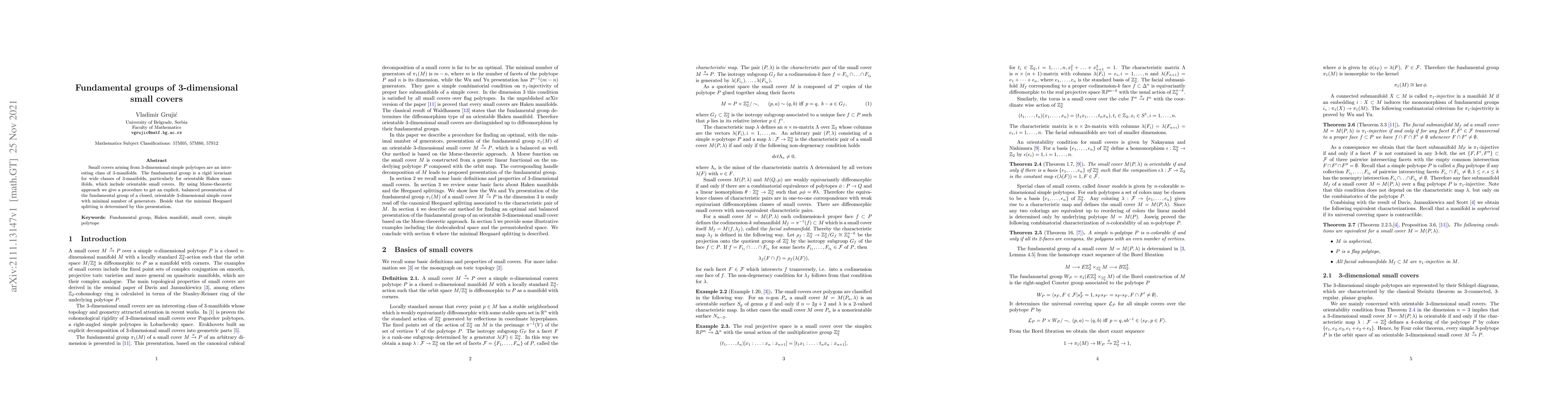 Small covers arising from 3-dimensional simple polytopes are an interesting class of 3-manifolds. The fundamental group is a rigid invariant for wide classes of 3-manifolds, particularly for orientable Haken manifolds, which include orientable small covers. By using Morse-theoretic approach we give a procedure to get an explicit, balanced presentation of the fundamental group of a closed, orientable 3-dimensional simple cover with minimal number of generators. Beside that the minimal Heegaard splitting is determined by this presentation.