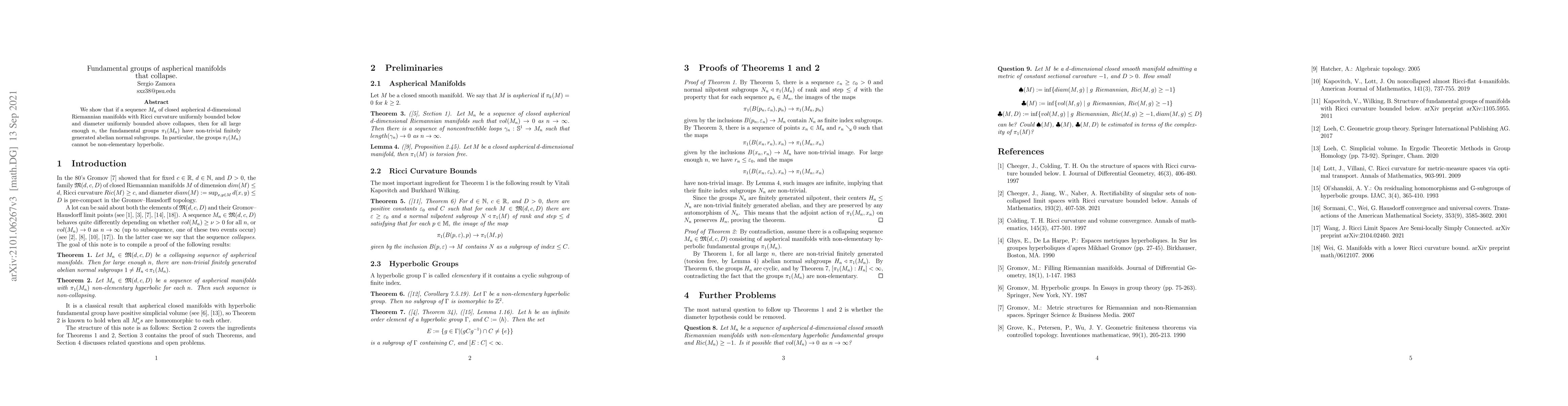 This paper demonstrates that in a sequence of collapsing aspherical $d$-dimensional Riemannian manifolds with bounded Ricci curvature and diameter, the fundamental groups $\pi_1(M_n)$ for sufficiently large $n$ contain non-trivial finitely generated abelian normal subgroups, implying they cannot be non-elementary hyperbolic.