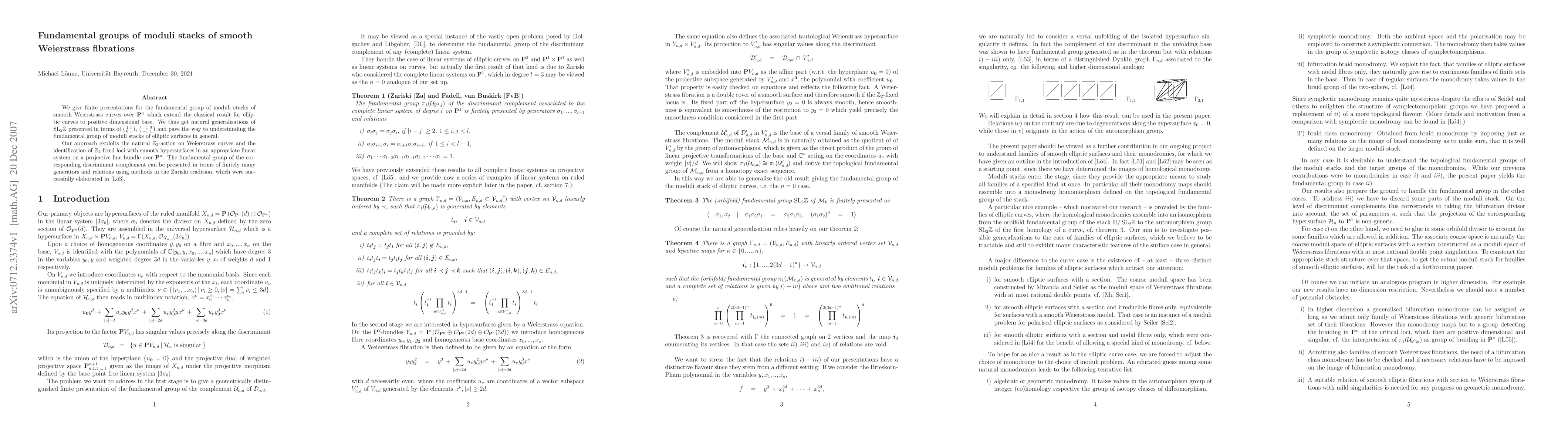 We give finite presentations for the fundamental group of moduli stacks of smooth Weierstrass curves over complex projective space P^n which extend the classical result for elliptic curves to positive dimensional base. We thus get natural generalisations of SL_2(Z) and pave the way to understanding the fundamental group of moduli stacks of elliptic surfaces in general. Our approach exploits the natural involution on Weierstrass curves and the identification of its fixed loci with smooth hypersurfaces in an appropriate linear system on a projective line bundle over P^n. The fundamental group of the corresponding discriminant complement can be presented in terms of finitely many generators and relations using methods in the Zariski tradition, which were sucessfully elaborated in mathAG/0602371.