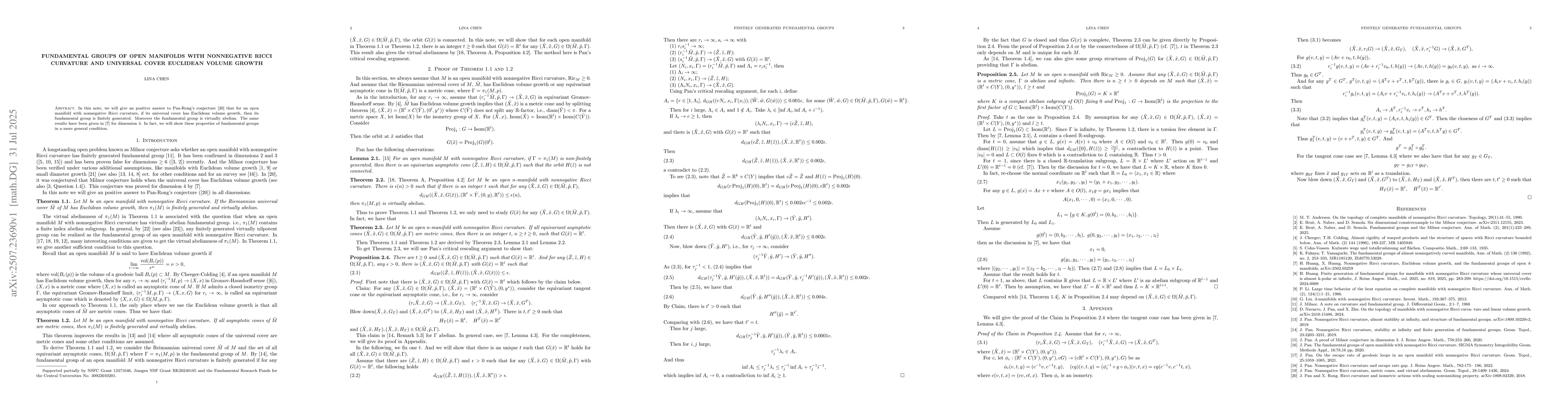 In this note, we will give an positive answer to Pan-Rong's conjecture that for an open manifold with nonnegative Ricci curvature, if its universal cover has Euclidean volume growth, then its fundamental group is finitely generated. Moreover the fundamental group is virtually abelian. The same result has been given by H.Huang-X.Huang for dimension 4. In fact, we will show the fundamental group finitely generated in a more general condition.