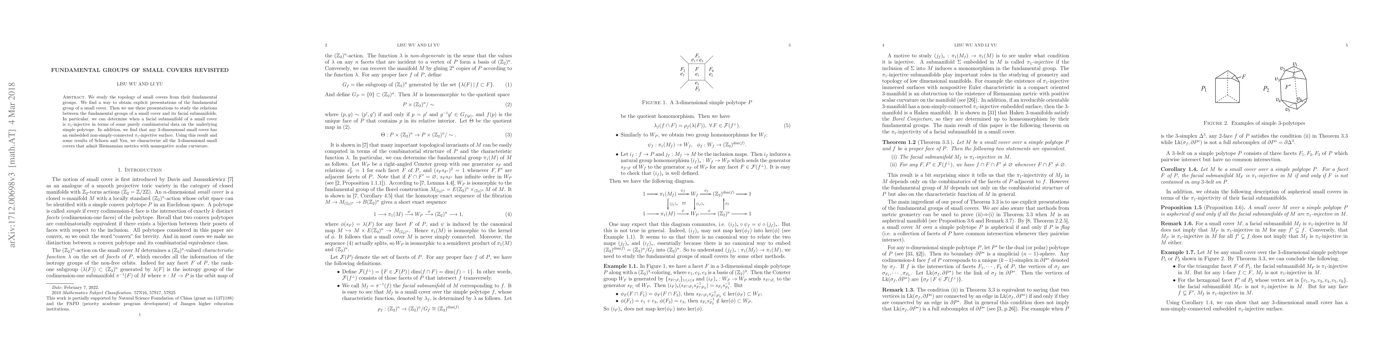 This paper explores the fundamental groups of small covers, providing explicit presentations and analyzing their relationships with facial submanifolds. It determines when these submanifolds are $\pi_1$-injective through combinatorial data, and finds that 3-dimensional small covers contain embedded $\pi_1$-injective surfaces, which helps characterize those with nonnegative scalar curvature metrics.