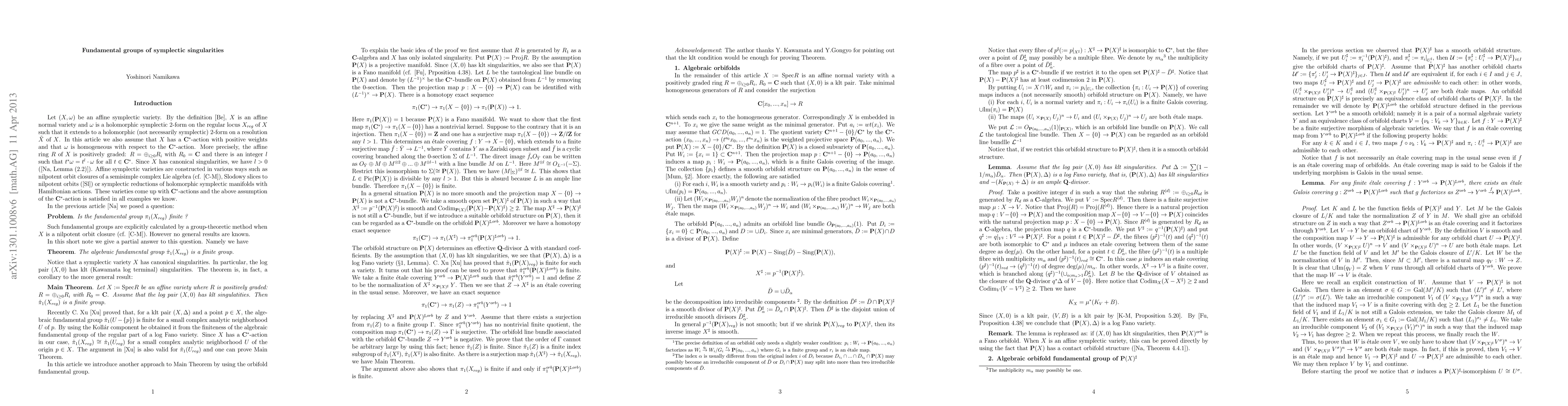Let (X, \omega) be an affine symplectic variety. Assume that X has a C^*-action with positive weights and \omega is homogeneous with respect to the C^*-action. We prove that the algebraic fundamental group of the smooth locus X_{reg} is finite. This is a collorary to a more general theorem: If an affine variety X has a C^*action with positive weights and the log pair (X, 0) has klt singularities, then the algebraic fundamental group of X_{reg} is finite.