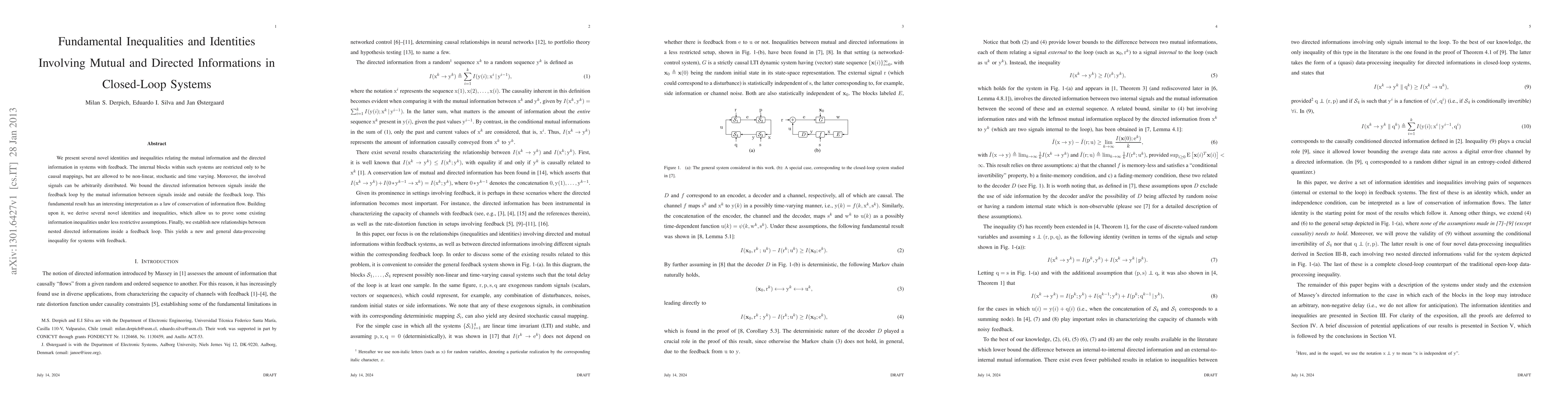 We present several novel identities and inequalities relating the mutual information and the directed information in systems with feedback. The internal blocks within such systems are restricted only to be causal mappings, but are allowed to be non-linear, stochastic and time varying. Moreover, the involved signals can be arbitrarily distributed. We bound the directed information between signals inside the feedback loop by the mutual information between signals inside and outside the feedback loop. This fundamental result has an interesting interpretation as a law of conservation of information flow. Building upon it, we derive several novel identities and inequalities, which allow us to prove some existing information inequalities under less restrictive assumptions. Finally, we establish new relationships between nested directed informations inside a feedback loop. This yields a new and general data-processing inequality for systems with feedback.