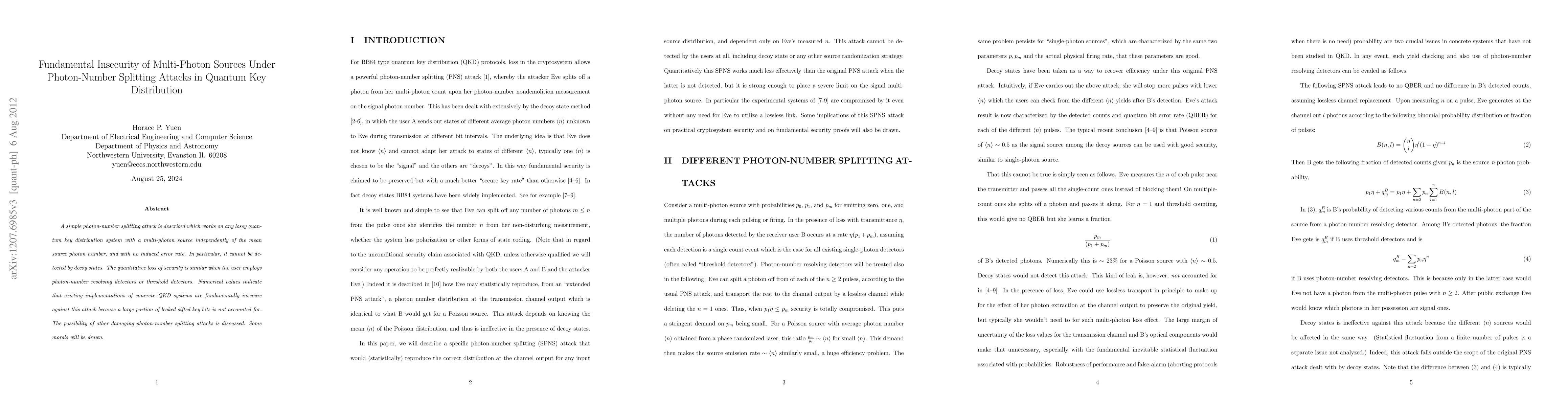 This paper reveals a fundamental insecurity in multi-photon sources used in quantum key distribution (QKD) systems, demonstrating a photon-number splitting attack that compromises security without inducing detectable error rates. Existing QKD implementations are shown to be fundamentally insecure due to unaddressed leakage of sifted key bits.