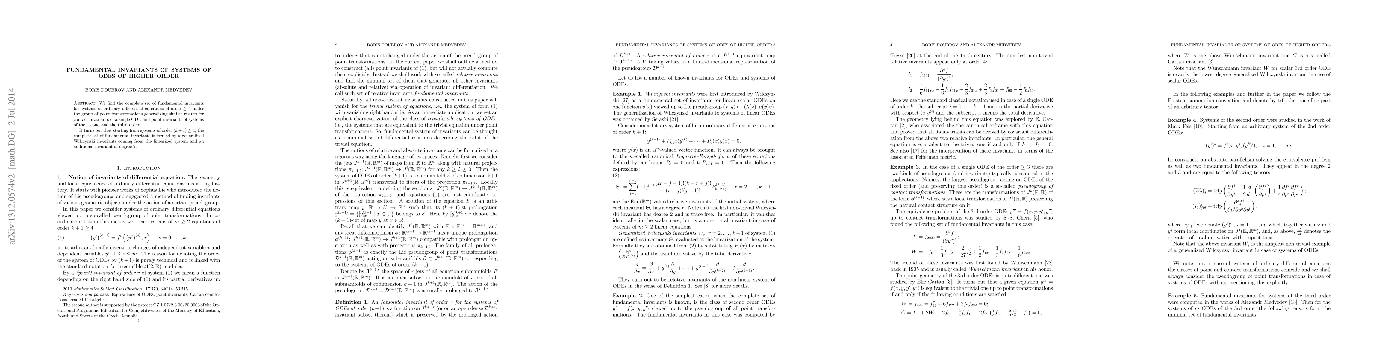 This paper identifies the complete set of fundamental invariants for systems of ordinary differential equations (ODEs) of order $\ge 4$ under point transformations, extending previous results for lower-order systems. It concludes that starting from order 4, the invariants consist of $k$ generalized Wilczynski invariants and an additional degree 2 invariant.