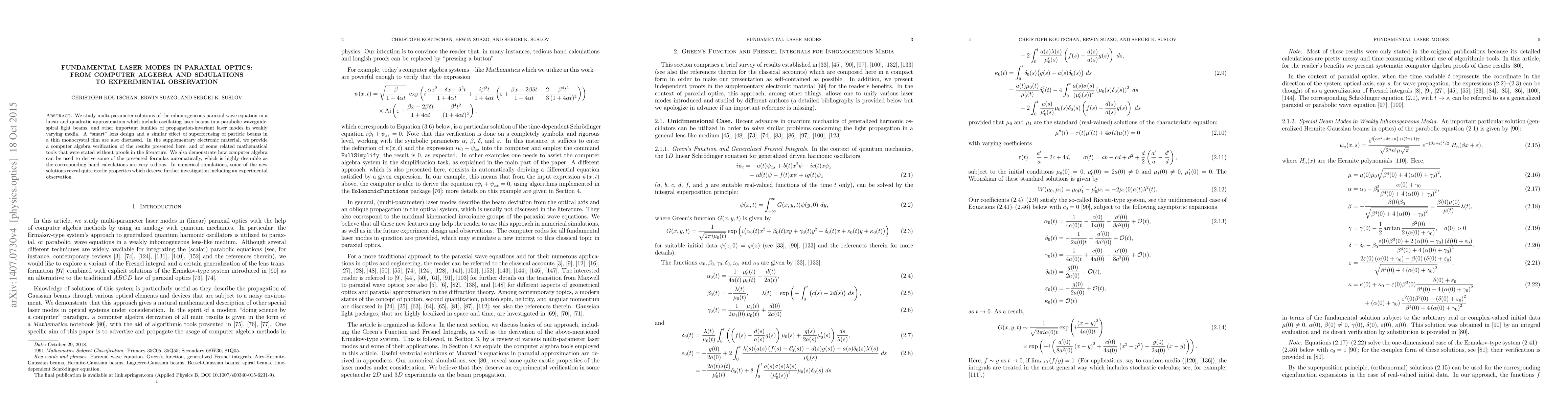 We study multi-parameter solutions of the inhomogeneous paraxial wave equation in a linear and quadratic approximation which include oscillating laser beams in a parabolic waveguide, spiral light beams, and other important families of propagation-invariant laser modes in weakly varying media. A "smart" lens design and a similar effect of superfocusing of particle beams in a thin monocrystal film are also discussed. In the supplementary electronic material, we provide a computer algebra verification of the results presented here, and of some related mathematical tools that were stated without proofs in the literature. We also demonstrate how computer algebra can be used to derive some of the presented formulas automatically, which is highly desirable as the corresponding hand calculations are very tedious. In numerical simulations, some of the new solutions reveal quite exotic properties which deserve further investigation including an experimental observation.