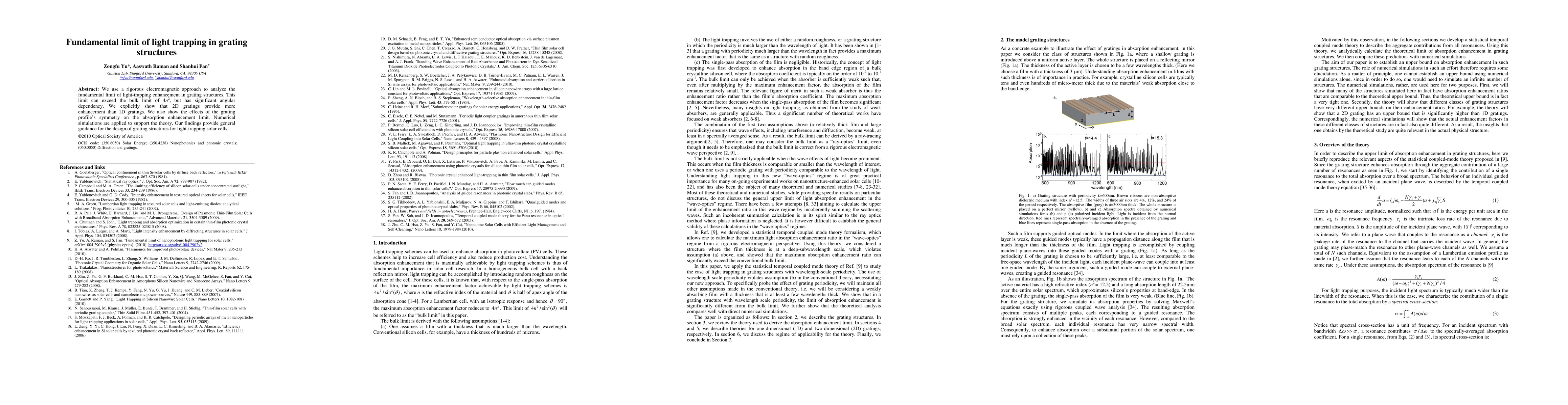 This paper rigorously analyzes the fundamental limit of light-trapping enhancement in grating structures, demonstrating that 2D gratings outperform 1D gratings and that the limit can exceed the bulk limit of 4n^2, though it is significantly angular-dependent. Numerical simulations support these findings, offering design guidance for optimizing light-trapping in solar cells.