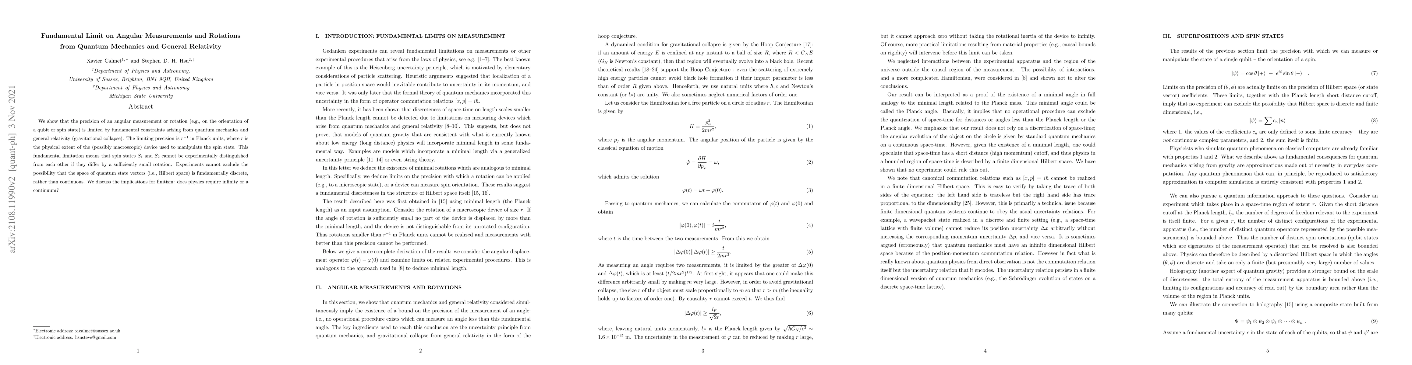 This paper explores the fundamental limits on angular measurements and rotations imposed by quantum mechanics and general relativity, revealing a precision limit of $r^{-1}$ in Planck units, where $r$ is the device's physical extent. It suggests that very small rotations may be indistinguishable, hinting at a potentially discrete nature of quantum state vectors.