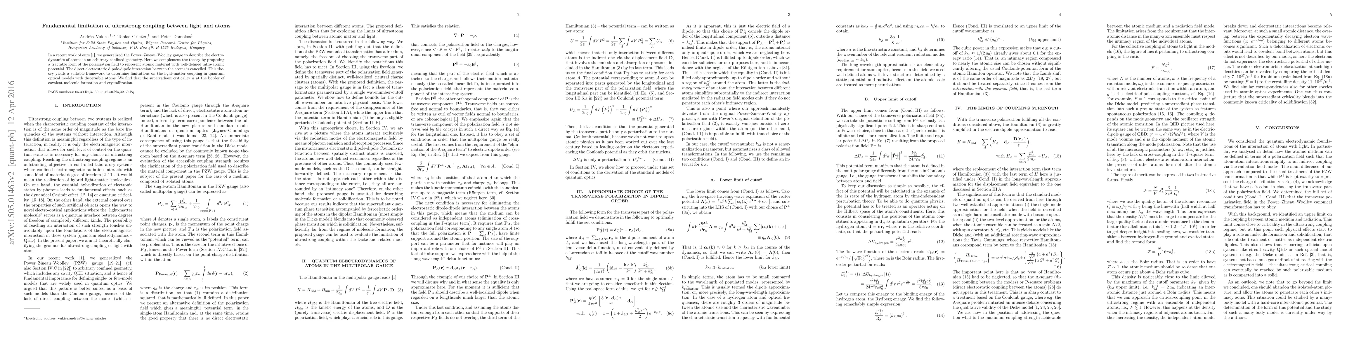 In a recent work of ours [Phys. Rev. Lett. 112, 073601 (2014)], we generalized the Power-Zineau-Woolley gauge to describe the electrodynamics of atoms in an arbitrary confined geometry. Here we complement the theory by proposing a tractable form of the polarization field to represent atomic material with well-defined intra-atomic potential. The direct electrostatic dipole-dipole interaction between the atoms is canceled. This theory yields a suitable framework to determine limitations on the light-matter coupling in quantum optical models with discernible atoms. We find that the superradiant criticality is at the border of covalent molecule formation and crystallization.