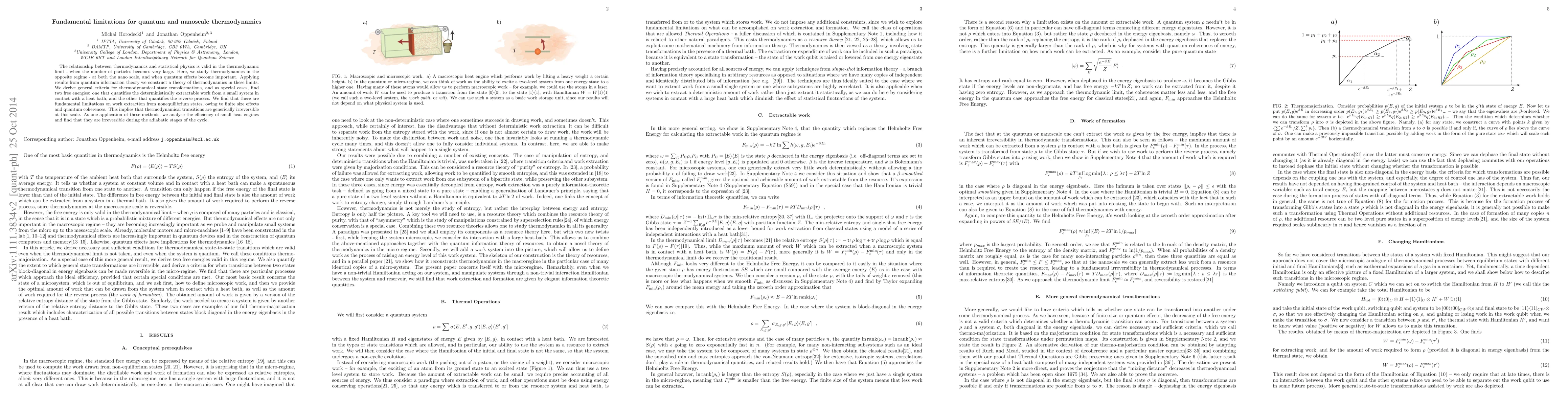 The relationship between thermodynamics and statistical physics is valid in the thermodynamic limit - when the number of particles becomes very large. Here, we study thermodynamics in the opposite regime - at both the nano scale, and when quantum effects become important. Applying results from quantum information theory we construct a theory of thermodynamics in these limits. We derive general criteria for thermodynamical state transformations, and as special cases, find two free energies: one that quantifies the deterministically extractable work from a small system in contact with a heat bath, and the other that quantifies the reverse process. We find that there are fundamental limitations on work extraction from nonequilibrium states, owing to finite size effects and quantum coherences. This implies that thermodynamical transitions are generically irreversible at this scale. As one application of these methods, we analyse the efficiency of small heat engines and find that they are irreversible during the adiabatic stages of the cycle.