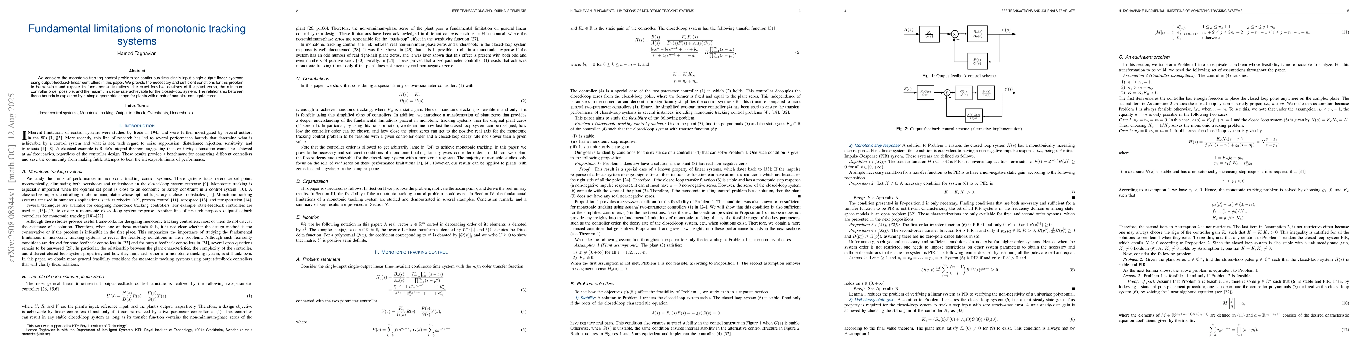We consider the monotonic tracking control problem for continuous-time single-input single-output linear systems using output-feedback linear controllers in this paper. We provide the necessary and sufficient conditions for this problem to be solvable and expose its fundamental limitations: the exact feasible locations of the plant zeros, the minimum controller order possible, and the maximum decay rate achievable for the closed-loop system. The relationship between these bounds is explained by a simple geometric shape for plants with a pair of complex-conjugate zeros.