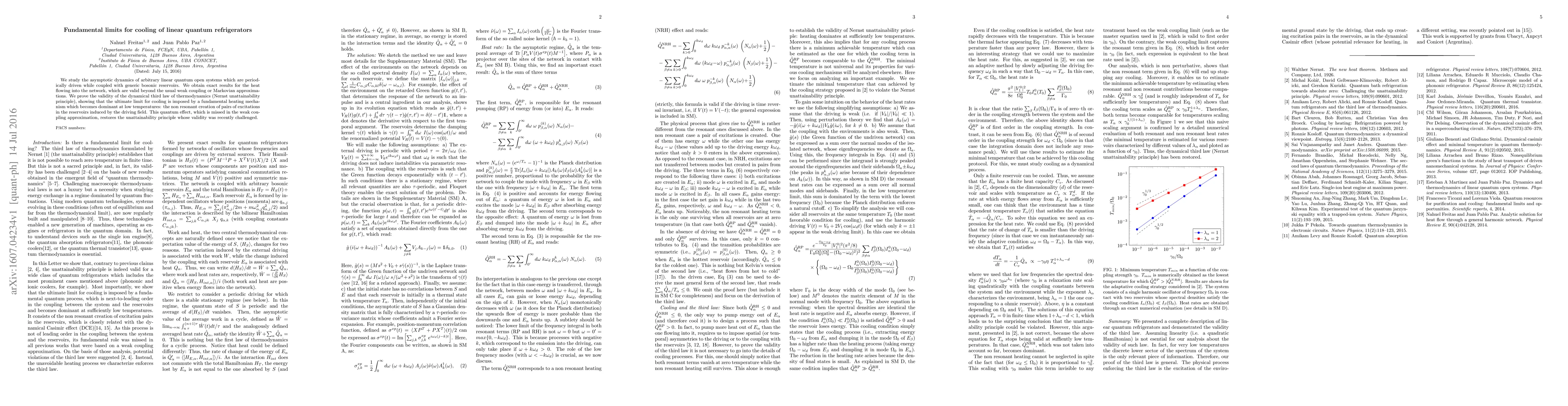 The paper presents exact results for heat flow in linear quantum refrigerators, extending beyond weak coupling approximations, and proves the validity of the dynamical third law of thermodynamics.