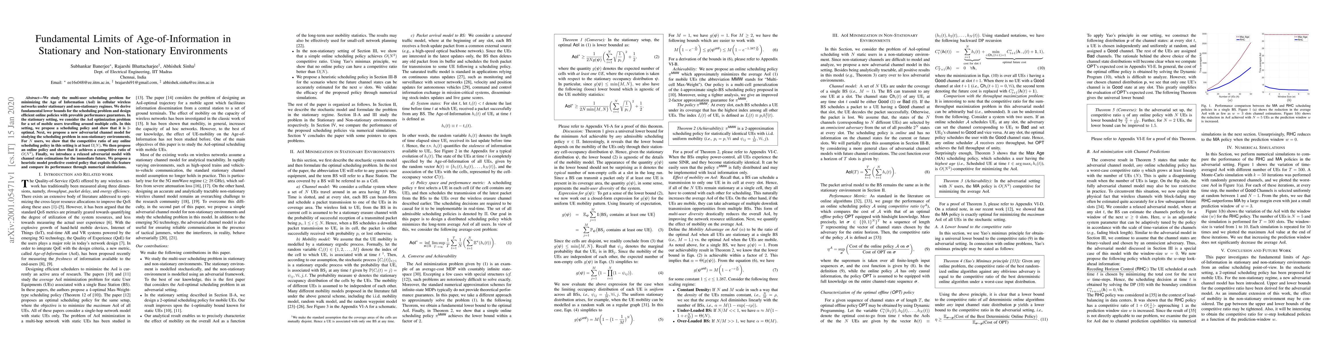 We study the multi-user scheduling problem for minimizing the Age of Information (AoI) in cellular wireless networks under stationary and non-stationary regimes. We derive fundamental lower bounds for the scheduling problem and design efficient online policies with provable performance guarantees. In the stationary setting, we consider the AoI optimization problem for a set of mobile users travelling around multiple cells. In this setting, we propose a scheduling policy and show that it is $2$-optimal. Next, we propose a new adversarial channel model for studying the scheduling problem in non-stationary environments. For $N$ users, we show that the competitive ratio of any online scheduling policy in this setting is at least $\Omega(N)$. We then propose an online policy and show that it achieves a competitive ratio of $O(N^2)$. Finally, we introduce a relaxed adversarial model with channel state estimations for the immediate future. We propose a heuristic model predictive control policy that exploits this feature and compare its performance through numerical simulations.