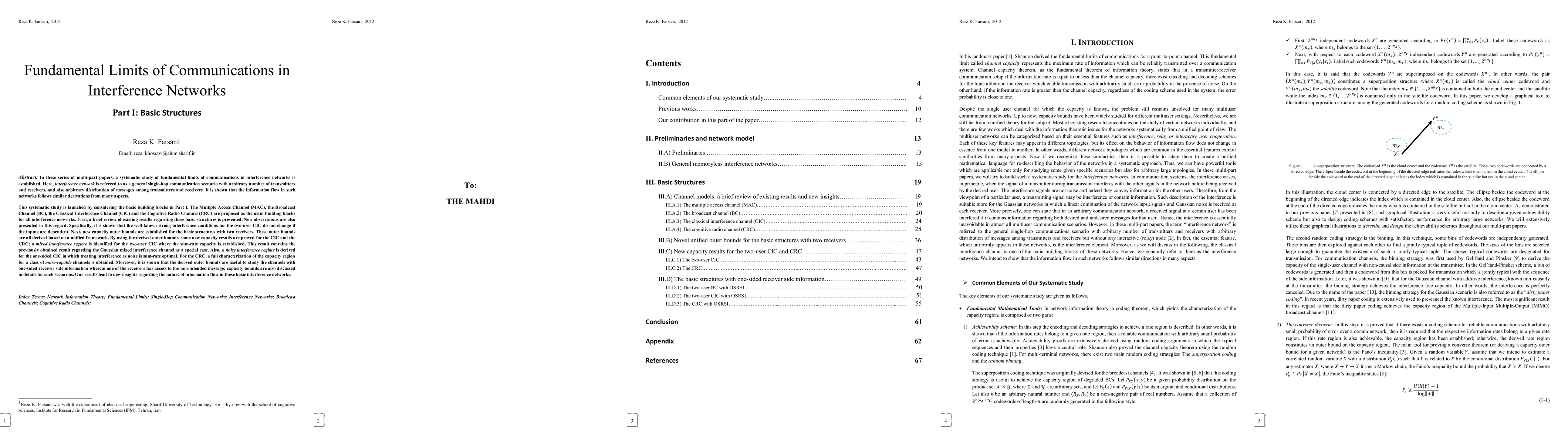 This paper systematically explores fundamental limits in interference networks, introducing basic structures like the MAC, BC, CIC, and CRC. It establishes new capacity outer bounds for these basic structures, identifies mixed and noisy interference regimes, and characterizes capacity regions for more-capable cognitive radio channels.
