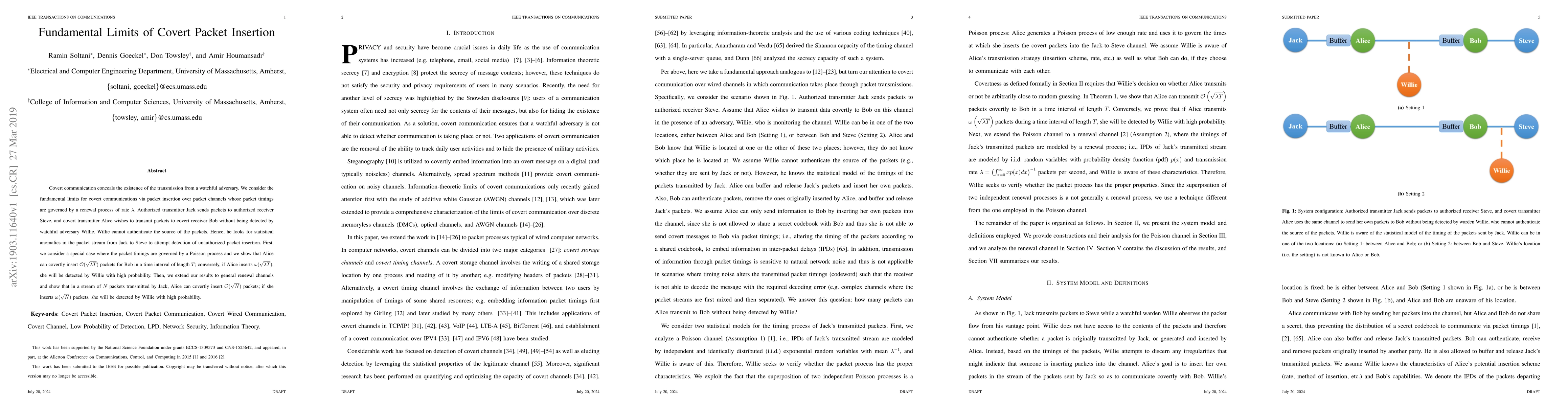 This paper investigates the fundamental limits of covert packet insertion in communication channels monitored by an adversary. It demonstrates that covert transmitter Alice can insert $\mathcal{O}(\sqrt{\lambda T})$ packets into Jack's stream without detection over time $T$, extending this to $\mathcal{O}(\sqrt{N})$ packets in a general renewal process, beyond which detection is highly probable.
