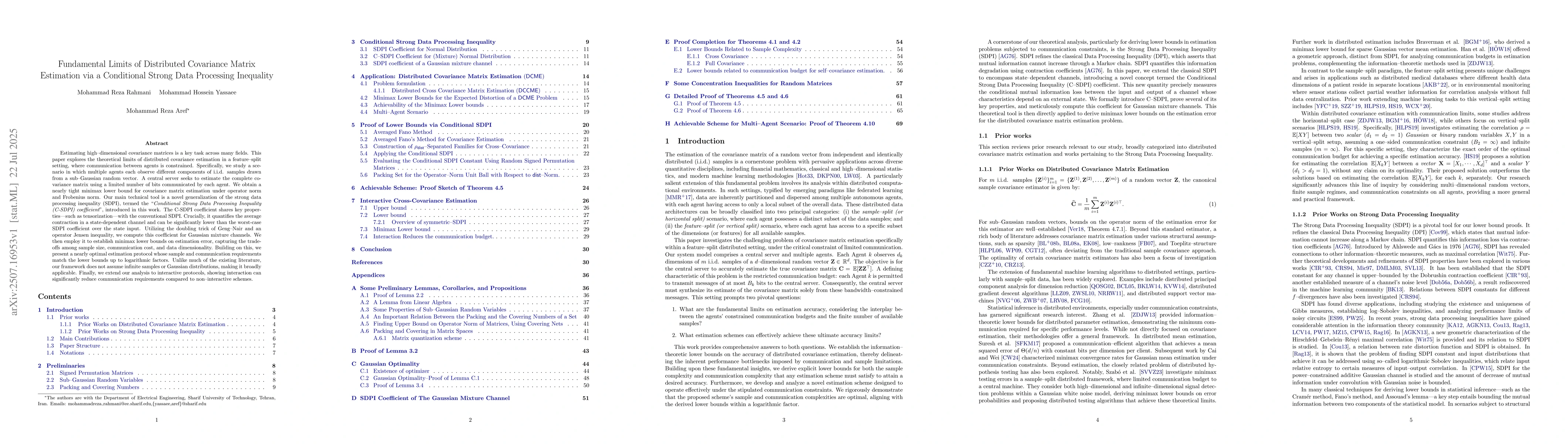 Estimating high-dimensional covariance matrices is a key task across many fields. This paper explores the theoretical limits of distributed covariance estimation in a feature-split setting, where communication between agents is constrained. Specifically, we study a scenario in which multiple agents each observe different components of i.i.d. samples drawn from a sub-Gaussian random vector. A central server seeks to estimate the complete covariance matrix using a limited number of bits communicated by each agent. We obtain a nearly tight minimax lower bound for covariance matrix estimation under operator norm and Frobenius norm. Our main technical tool is a novel generalization of the strong data processing inequality (SDPI), termed the Conditional Strong Data Processing Inequality (C-SDPI) coefficient, introduced in this work. The C-SDPI coefficient shares key properties such as tensorization with the conventional SDPI. Crucially, it quantifies the average contraction in a state-dependent channel and can be significantly lower than the worst-case SDPI coefficient over the state input. Utilizing the doubling trick of Geng-Nair and an operator Jensen inequality, we compute this coefficient for Gaussian mixture channels. We then employ it to establish minimax lower bounds on estimation error, capturing the trade-offs among sample size, communication cost, and data dimensionality. Building on this, we present a nearly optimal estimation protocol whose sample and communication requirements match the lower bounds up to logarithmic factors. Unlike much of the existing literature, our framework does not assume infinite samples or Gaussian distributions, making it broadly applicable. Finally, we extend our analysis to interactive protocols, showing interaction can significantly reduce communication requirements compared to non-interactive schemes.
