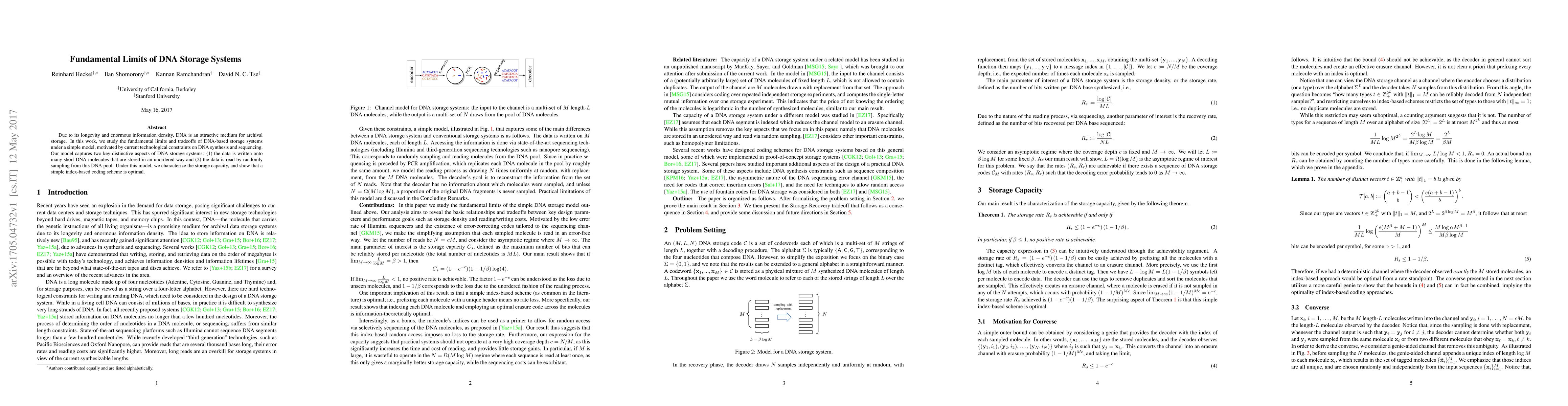This paper investigates the fundamental limits and tradeoffs of DNA storage systems, focusing on the capacity under a model that considers the synthesis and sequencing constraints. It finds that an index-based coding scheme is optimal for maximizing storage capacity when data is written onto and read from many short, unordered DNA molecules.