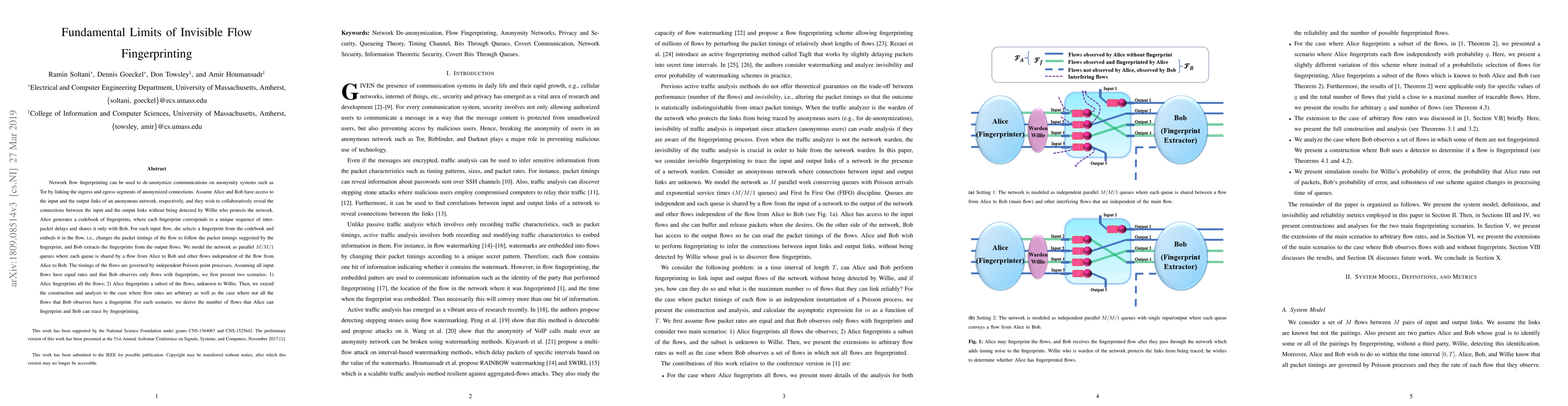 This paper explores the fundamental limits of invisible flow fingerprinting in anonymized networks, where Alice and Bob aim to reveal connections between input and output links without detection. It models the network using parallel $M/M/1$ queues and analyzes scenarios where Alice fingerprints all or a subset of flows, deriving the maximum number of traceable flows under various conditions.