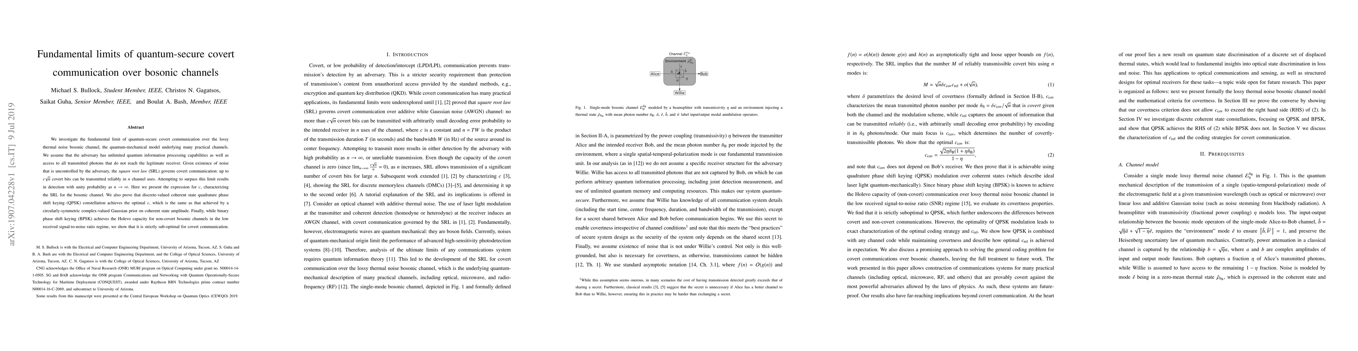 We investigate the fundamental limit of quantum-secure covert communication over the lossy thermal noise bosonic channel, the quantum-mechanical model underlying many practical channels. We assume that the adversary has unlimited quantum information processing capabilities as well as access to all transmitted photons that do not reach the legitimate receiver. Given existence of noise that is uncontrolled by the adversary, the square root law (SRL) governs covert communication: up to c*sqrt{n} covert bits can be transmitted reliably in n channel uses. Attempting to surpass this limit results in detection with unity probability as n approaches infinity. Here we present the expression for c, characterizing the SRL for the bosonic channel. We also prove that discrete-valued coherent state quadrature phase shift keying (QPSK) constellation achieves the optimal c, which is the same as that achieved by a circularly-symmetric complex-valued Gaussian prior on coherent state amplitude. Finally, while binary phase shift keying (BPSK) achieves the Holevo capacity for non-covert bosonic channels in the low received signal-to-noise ratio regime, we show that it is strictly sub-optimal for covert communication.