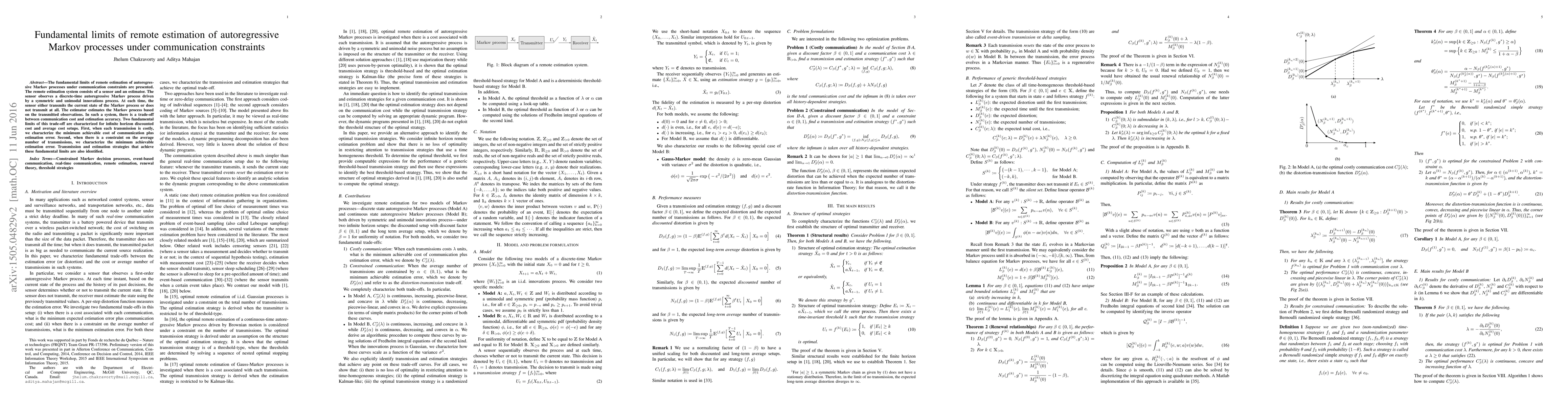This paper investigates the fundamental limits of remote estimation of Markov processes under communication constraints, identifying optimal strategies for minimizing communication costs and estimation errors. It characterizes the trade-off between communication cost and estimation accuracy in both infinite horizon and average cost setups.