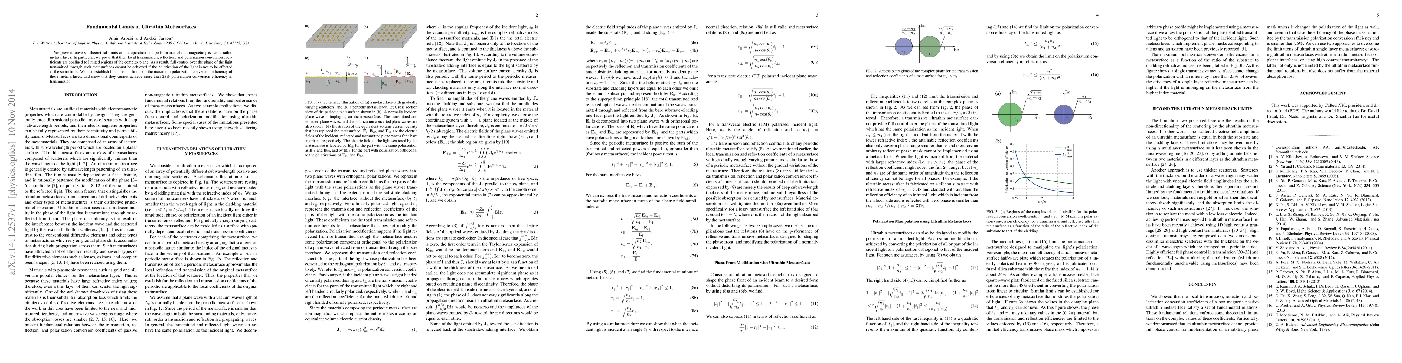 This paper establishes theoretical limits on the performance of non-magnetic passive ultrathin metasurfaces, demonstrating that their transmission, reflection, and polarization conversion coefficients are confined, preventing full phase control without affecting polarization. It also sets a maximum 25% polarization conversion efficiency limit for these metasurfaces.