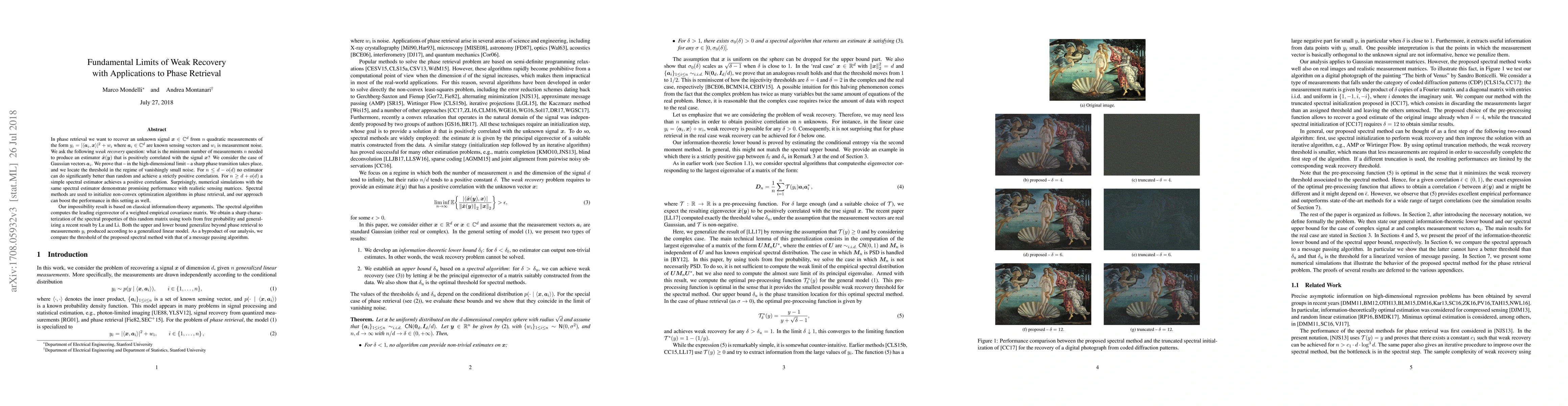 In phase retrieval we want to recover an unknown signal $\boldsymbol x\in\mathbb C^d$ from $n$ quadratic measurements of the form $y_i = |\langle{\boldsymbol a}_i,{\boldsymbol x}\rangle|^2+w_i$ where $\boldsymbol a_i\in \mathbb C^d$ are known sensing vectors and $w_i$ is measurement noise. We ask the following weak recovery question: what is the minimum number of measurements $n$ needed to produce an estimator $\hat{\boldsymbol x}(\boldsymbol y)$ that is positively correlated with the signal $\boldsymbol x$? We consider the case of Gaussian vectors $\boldsymbol a_i$. We prove that - in the high-dimensional limit - a sharp phase transition takes place, and we locate the threshold in the regime of vanishingly small noise. For $n\le d-o(d)$ no estimator can do significantly better than random and achieve a strictly positive correlation. For $n\ge d+o(d)$ a simple spectral estimator achieves a positive correlation. Surprisingly, numerical simulations with the same spectral estimator demonstrate promising performance with realistic sensing matrices. Spectral methods are used to initialize non-convex optimization algorithms in phase retrieval, and our approach can boost the performance in this setting as well. Our impossibility result is based on classical information-theory arguments. The spectral algorithm computes the leading eigenvector of a weighted empirical covariance matrix. We obtain a sharp characterization of the spectral properties of this random matrix using tools from free probability and generalizing a recent result by Lu and Li. Both the upper and lower bound generalize beyond phase retrieval to measurements $y_i$ produced according to a generalized linear model. As a byproduct of our analysis, we compare the threshold of the proposed spectral method with that of a message passing algorithm.