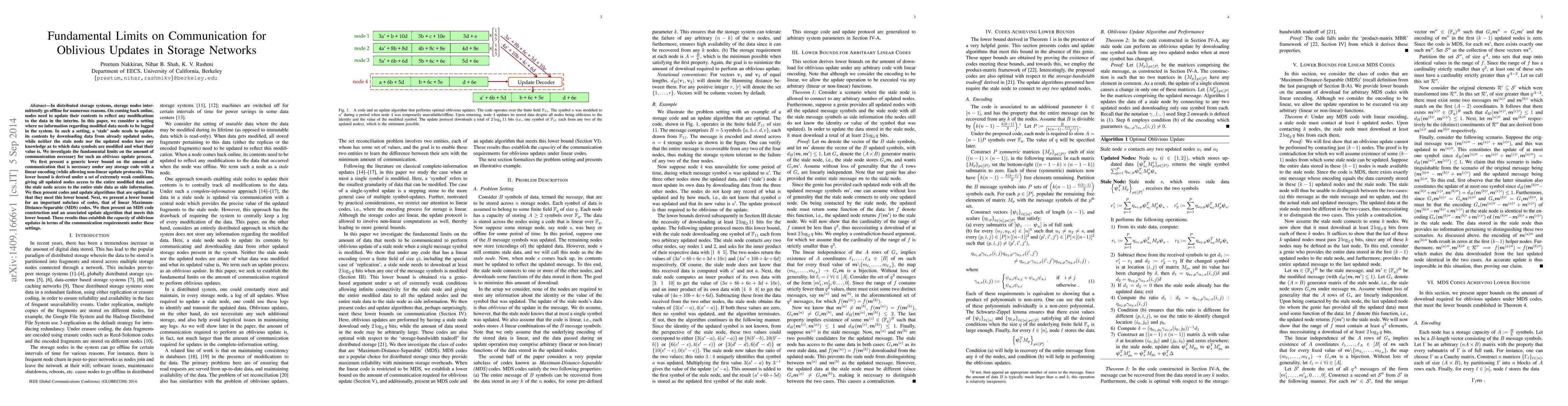 In distributed storage systems, storage nodes intermittently go offline for numerous reasons. On coming back online, nodes need to update their contents to reflect any modifications to the data in the interim. In this paper, we consider a setting where no information regarding modified data needs to be logged in the system. In such a setting, a 'stale' node needs to update its contents by downloading data from already updated nodes, while neither the stale node nor the updated nodes have any knowledge as to which data symbols are modified and what their value is. We investigate the fundamental limits on the amount of communication necessary for such an "oblivious" update process. We first present a generic lower bound on the amount of communication that is necessary under any storage code with a linear encoding (while allowing non-linear update protocols). This lower bound is derived under a set of extremely weak conditions, giving all updated nodes access to the entire modified data and the stale node access to the entire stale data as side information. We then present codes and update algorithms that are optimal in that they meet this lower bound. Next, we present a lower bound for an important subclass of codes, that of linear Maximum-Distance-Separable (MDS) codes. We then present an MDS code construction and an associated update algorithm that meets this lower bound. These results thus establish the capacity of oblivious updates in terms of the communication requirements under these settings.