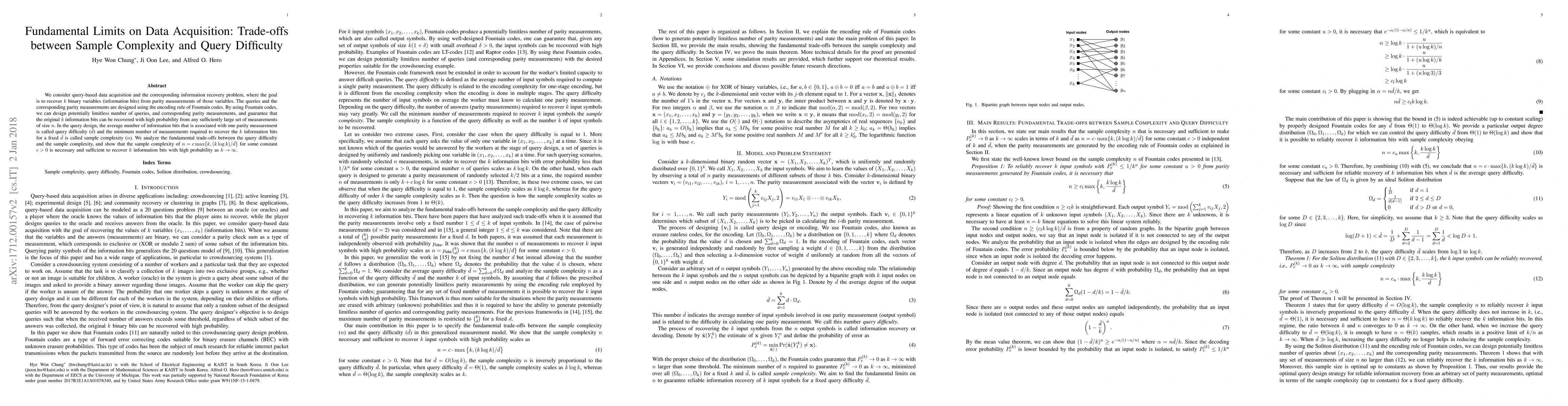 This research paper explores the limits of data acquisition through query-based methods, utilizing Fountain codes for potentially unlimited queries and parity measurements to recover binary variables. It establishes a necessary and sufficient condition for sample complexity (n) in terms of query difficulty ($\bar{d}$) and the number of information bits (k), showing n = c*max{k, (k log k)/\bar{d}} for some constant c > 0 as k approaches infinity.