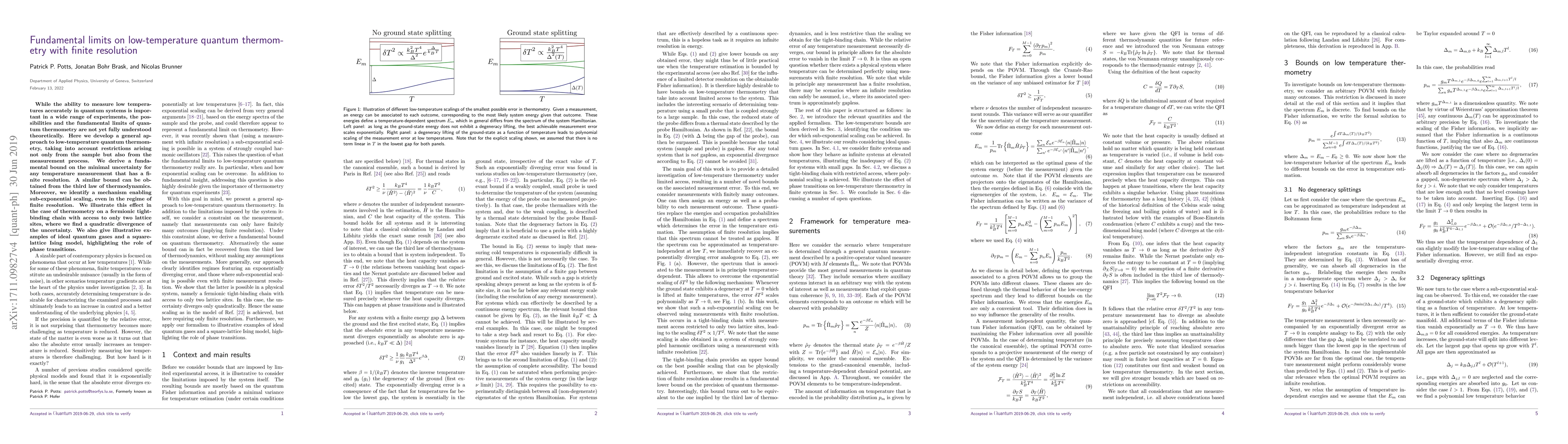 This paper develops a theoretical framework for low-temperature quantum thermometry, establishing fundamental limits on measurement accuracy due to finite resolution. It identifies a mechanism for sub-exponential scaling and demonstrates the quadratic divergence of uncertainty in a fermionic tight-binding chain, with examples from ideal quantum gases and the Ising model.