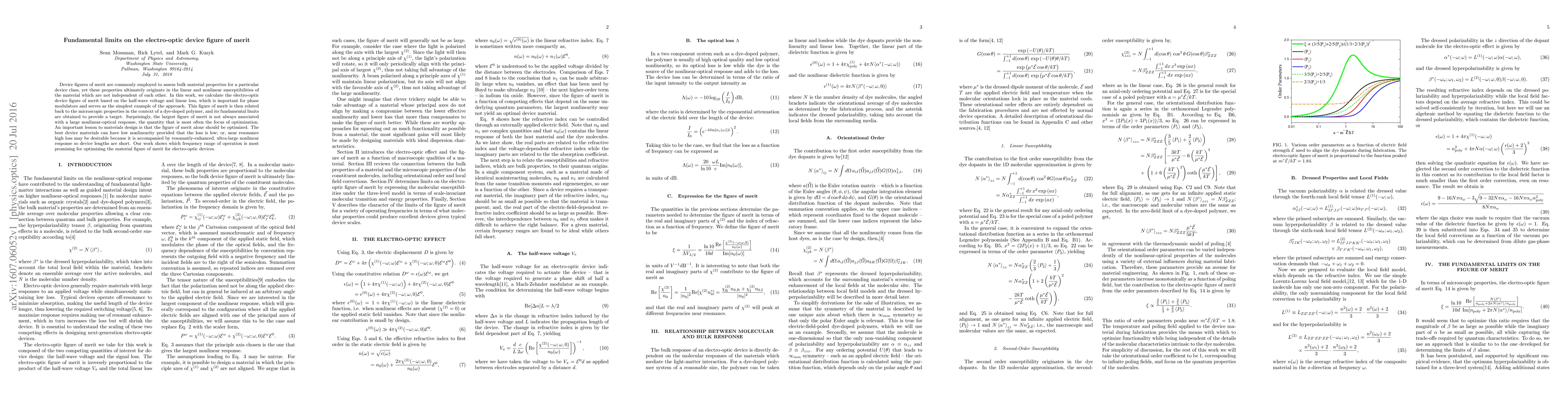Device figures of merit are commonly employed to assess bulk material properties for a particular device class, yet these properties ultimately originate in the linear and nonlinear susceptibilities of the material which are not independent of each other. In this work, we calculate the electro-optic device figure of merit based on the half-wave voltage and linear loss, which is important for phase modulators and serves as the simplest example of the approach. This figure of merit is then related back to the microscopic properties in the context of a dye-doped polymer, and its fundamental limits are obtained to provide a target. Surprisingly, the largest figure of merit is not always associated with a large nonlinear-optical response, the quantity that is most often the focus of optimization. An important lesson to materials design is that the figure of merit alone should be optimized. The best device materials can have low nonlinearity provided that the loss is low; or, near resonance high loss may be desirable because it is accompanied by resonantly-enhanced, ultra-large nonlinear response so device lengths are short. Our work shows which frequency range of operation is most promising for optimizing the material figure of merit for electro-optic devices.