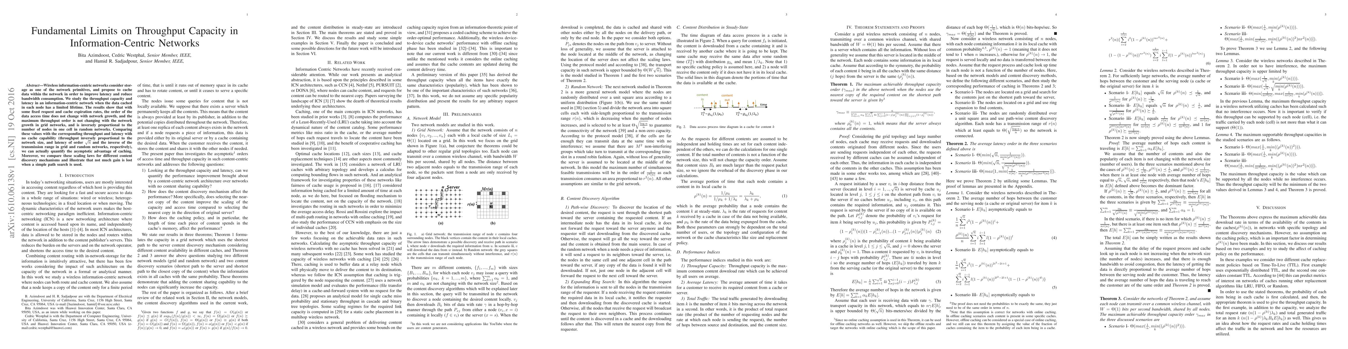 Wireless information-centric networks consider storage as one of the network primitives, and propose to cache data within the network in order to improve latency and reduce bandwidth consumption. We study the throughput capacity and latency in an information-centric network when the data cached in each node has a limited lifetime. The results show that with some fixed request and cache expiration rates, the order of the data access time does not change with network growth, and the maximum throughput order is not changing with the network growth in grid networks, and is inversely proportional to the number of nodes in one cell in random networks. Comparing these values with the corresponding throughput and latency with no cache capability (throughput inversely proportional to the network size, and latency of order $\sqrt{n}$ and the inverse of the transmission range in grid and random networks, respectively), we can actually quantify the asymptotic advantage of caching. Moreover, we compare these scaling laws for different content discovery mechanisms and illustrate that not much gain is lost when a simple path search is used.